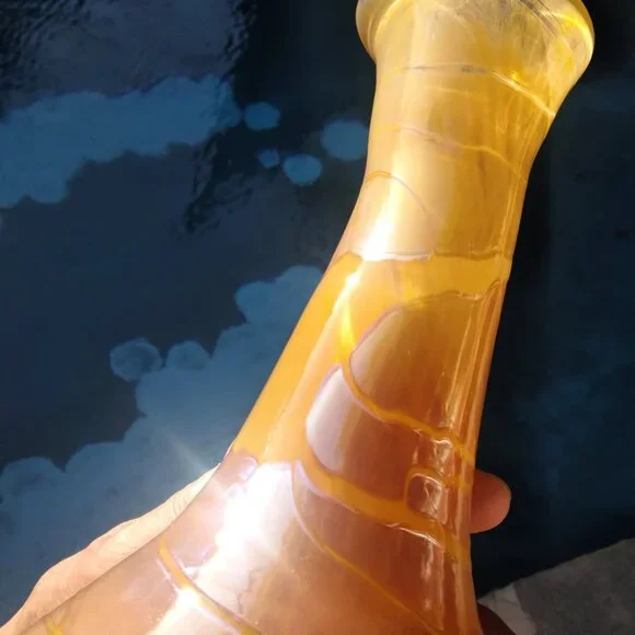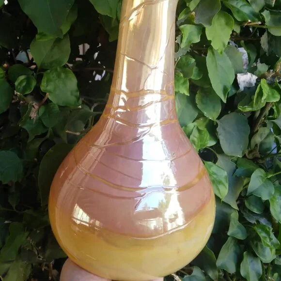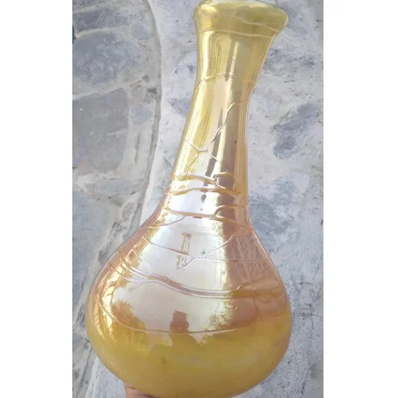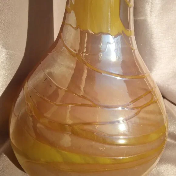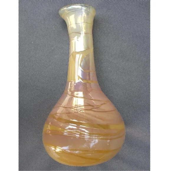 Stunning Vintage Threaded Iridescent Warm Tones Hand-Blown Art Glass VaseThis is a gorgeous Vintage Threaded Iridescent Warm Tones Hand-Blown Art Glass Vase.The vase is bulb shaped and has threads of clear warm yellow tones meandering and encircling the vase in a free form swirl.There are variations of oranges, ambers, golds and browns which are iridized and reflective. The top rim is shaped almost like a pouring spout.The vase measures approximately 11" tall by 6" wide and 2" on its neck and is in great vintage condition with no cracks, dings or bites.It does have small inherent hand-blown anomalies such as little bubbles and flecks of glass.This vase has an elegant and bohemian essence and would definitely add an exciting element to any environment.