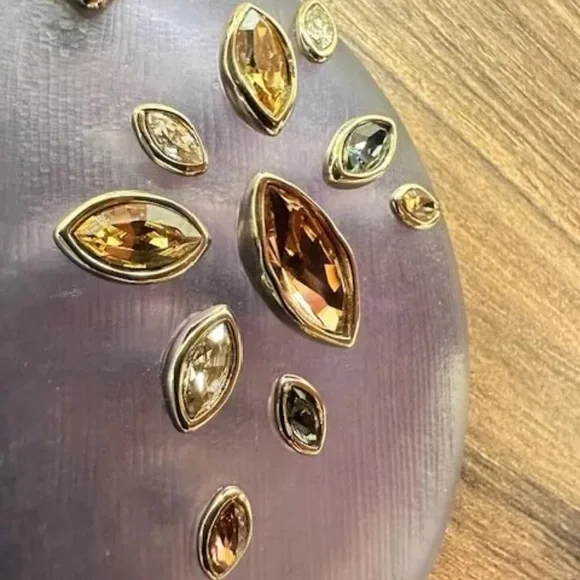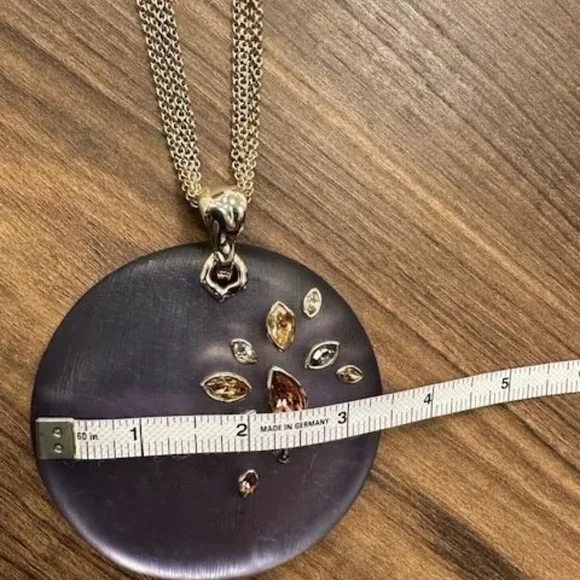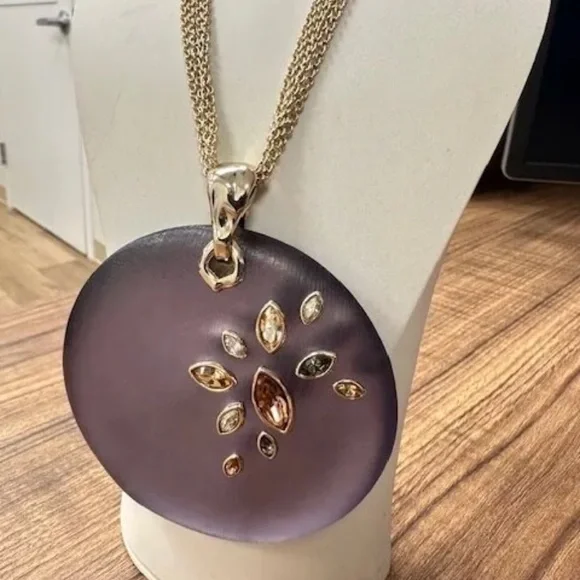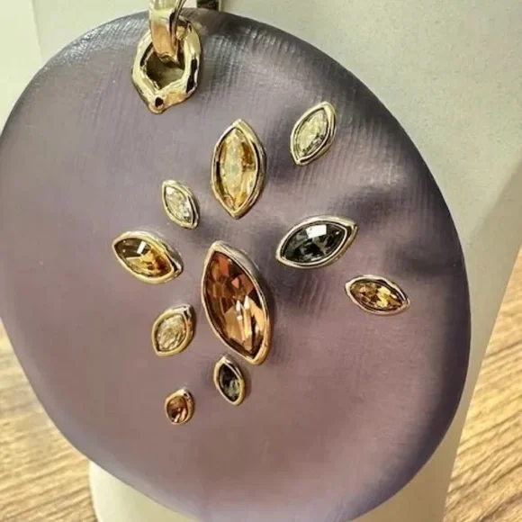 Alexis Bittar Purple 3.5” Lucite Disc Pendant Necklace Encrusted with Crystals.