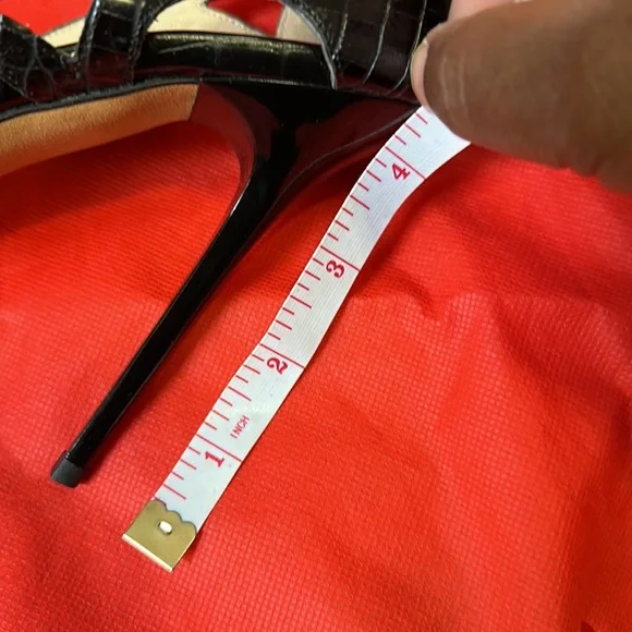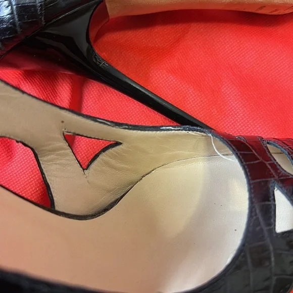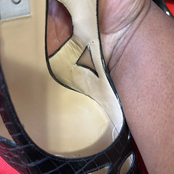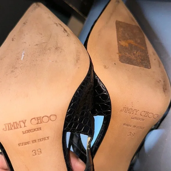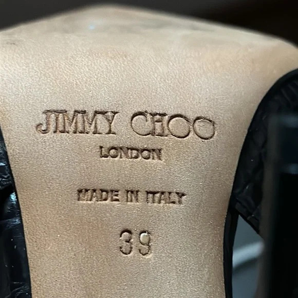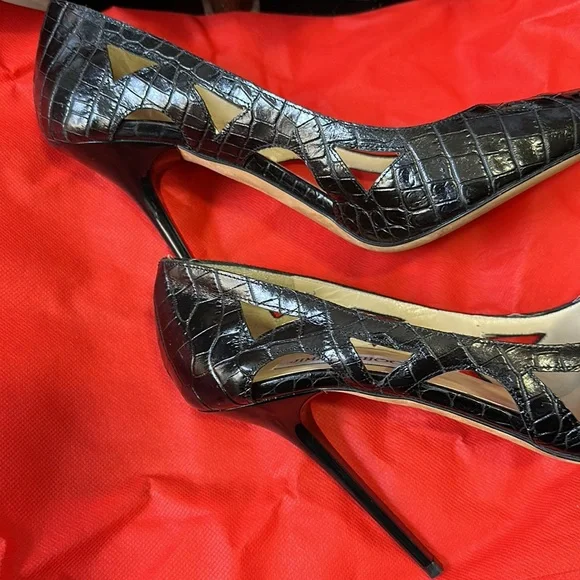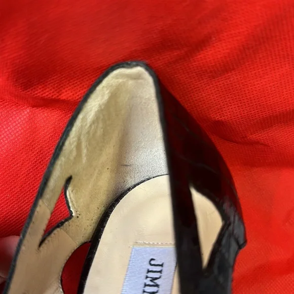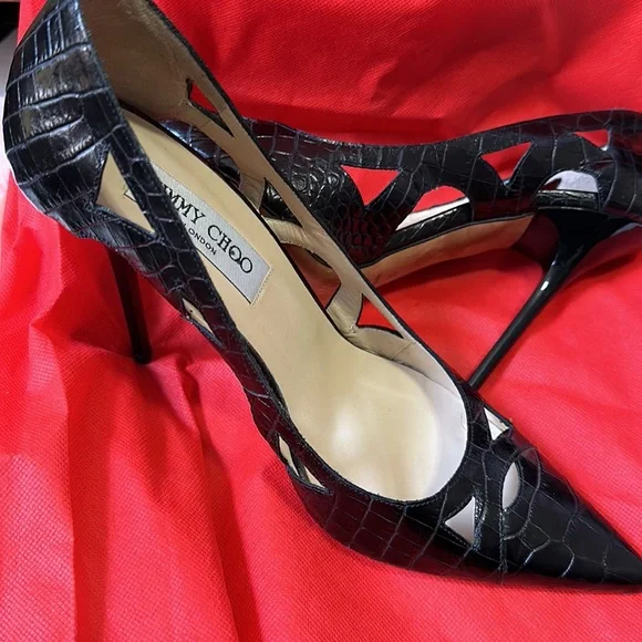 Beautiful pointed toe with cut out details and 4 inch heels by Jimmy Choo.Shoe has leather lining, patent leather heel and leather sole. No scratches. Some thread is visible around edge but leather is not unraveling.Does not have dust bag. These have never been worn as I have accepted the fact that I can’t wear stilettos anymore —-so why keep these hidden in my closet? Looking for a new home! Made in Italy.
