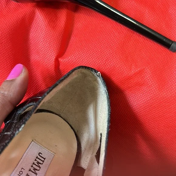 Beautiful pointed toe with cut out details and 4 inch heels by Jimmy Choo.Shoe has leather lining, patent leather heel and leather sole. No scratches. Some thread is visible...