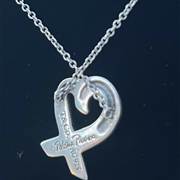 Tiffany & Co. Paloma Picasso Loving Heart Pre Loved Pendant . This design is part of the Paloma Picasso collection for Tiffany & Co., which started in 1980. The Tiffany & CoPaloma Picasso Loving Heart pendant necklace is made of sterling silver, as indicated by the "AG 925" stamp on the back.This necklace is a true Classic!