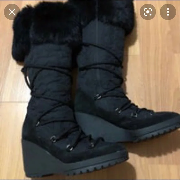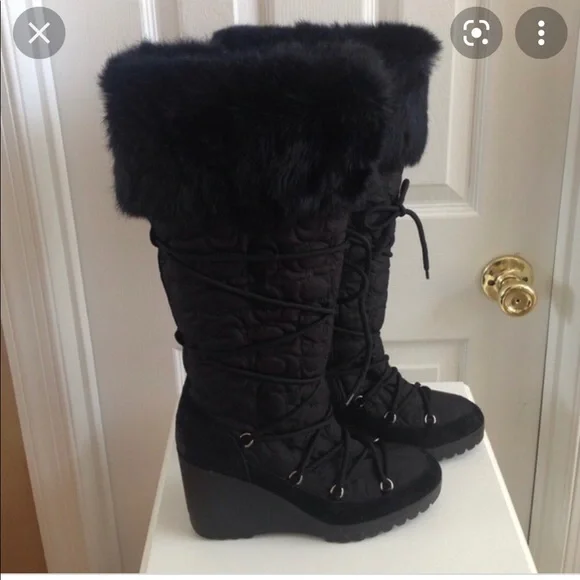 COACH SOFIE Rabbit Fur Trim Monogram, Knee High Platform Winter Snow Boots, WaterproofBlack, Size - 8Super Comfortable and Beatifully Fashionable Coach Winter Boots with Tons of Personality!Your feet will never be cold in these boots.They are lined in waterproof neoprene.The top of the boot is trimmed with genuine rabbit fur.The 3.75" wedge protects you from slipping or falling on ice.The 1" platform is very soft, so your feet never get tired.There is a side zipper and very sexy laces that wrap around your boots for extra elegance, which sets them apart from your average, bulky snow boots.The laces are inserted through a suede strip vertically running up the back of the boot so that they stay in place and don´t slip down.The boots were very gently worn just a couple of times.Purchased from Saks Fifth Avenue in New York for $695.
