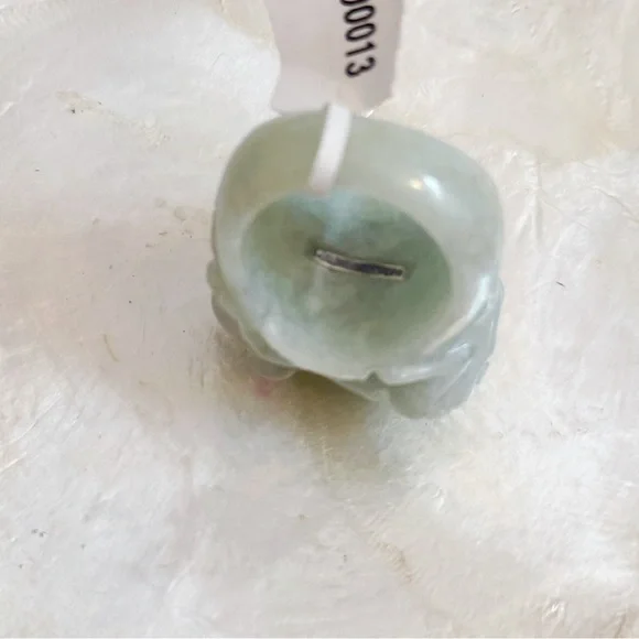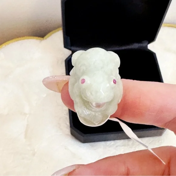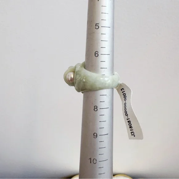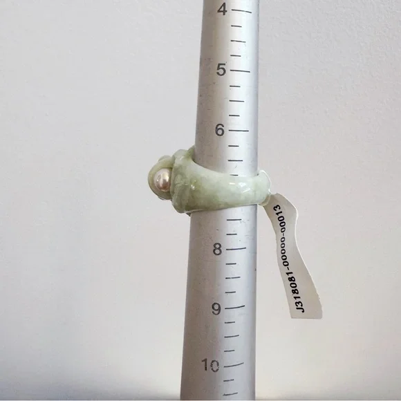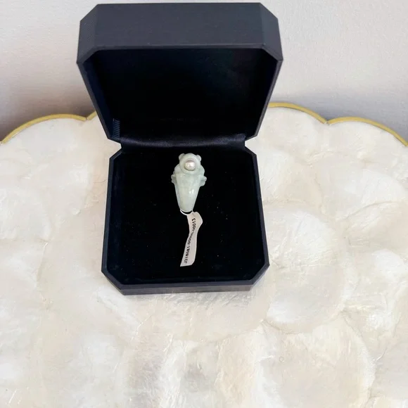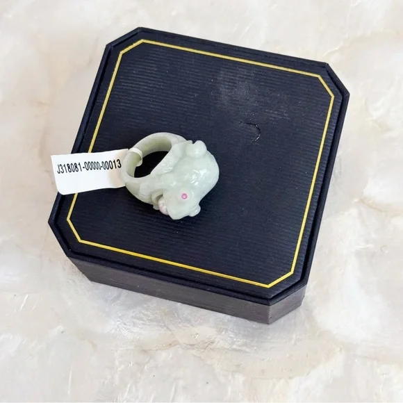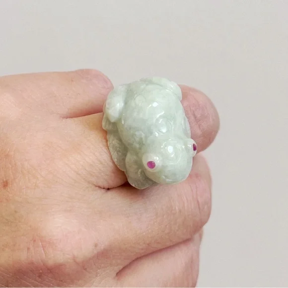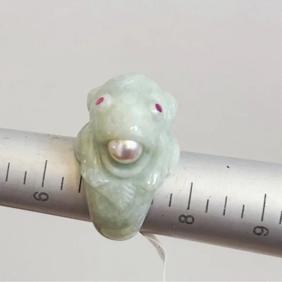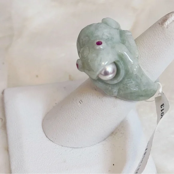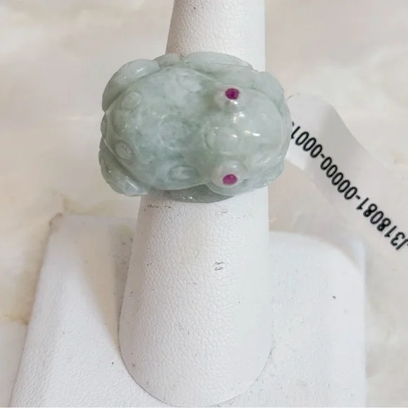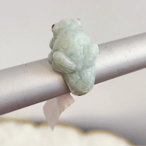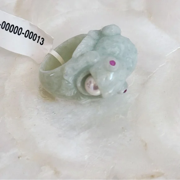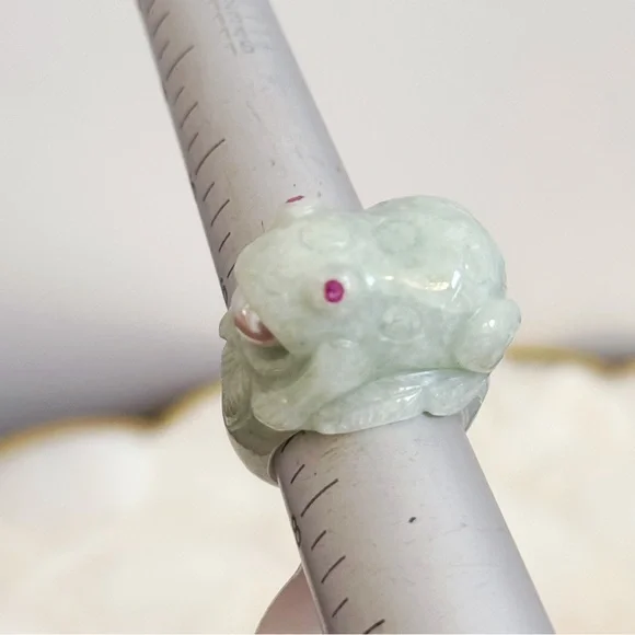 Light Green hand carved jade frog with ruby eyes. Stamped 925 underneath with genuine pearl in mouthBand width approximately: 1/4”NEW WITH TAGSComes with box but top of box damaged and up close with jewelers loupe pearl has indentationSize 7**I add my own personal tags on my items to ensure items are not used/ worn, and then returned**No returns please