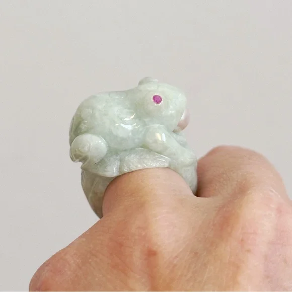 Hand carved Green Jade Ruby Eyes Pearl Frog Ring Sz 7 NEW