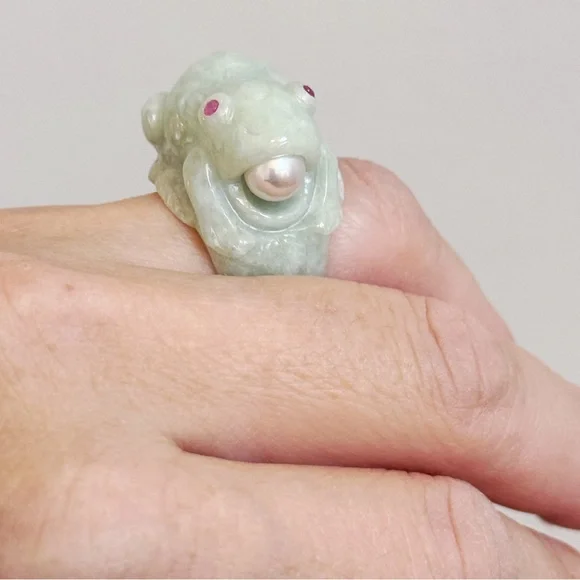 Light Green hand carved jade frog with ruby eyes. Stamped 925 underneath with genuine pearl in mouthBand width approximately: 1/4”NEW WITH TAGSComes with box but top of box...