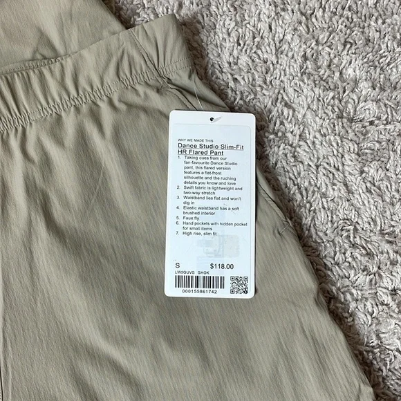NEW WITH TAGS Lululemon Dance Studio Slim-Fit High-Rise Flared Pant. In color Sheer Oak, size small, inseam 31”. On new square dot! Perfect pants for work or leisure. Light weight with some stretch. See full website description below, bundle & save.lightweight, swift fabricLightweightTwo-way stretchhigh rise, full lengthSlim fit skims your bodyFlares out from the knee to hemFull length intended to sit at anklefeaturesWaistband lies flat and won´t dig inElastic waistband has a soft brushed interiorFaux flyHand pockets with hidden pocket for small items