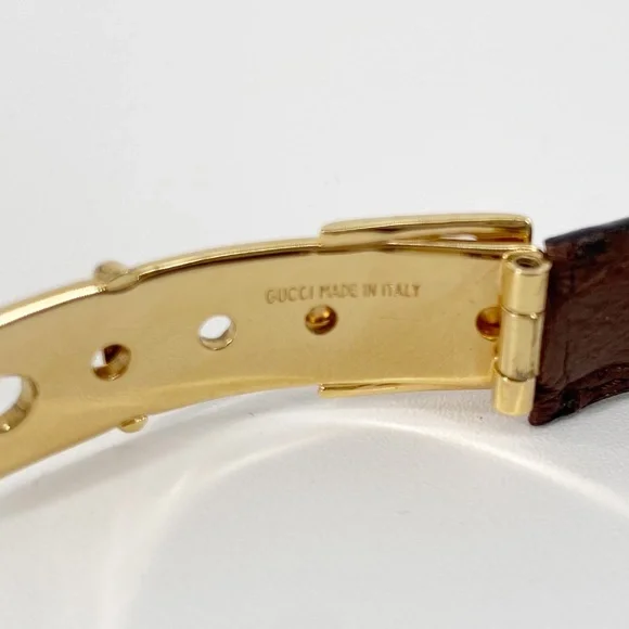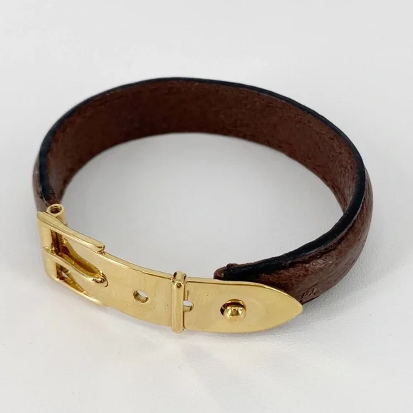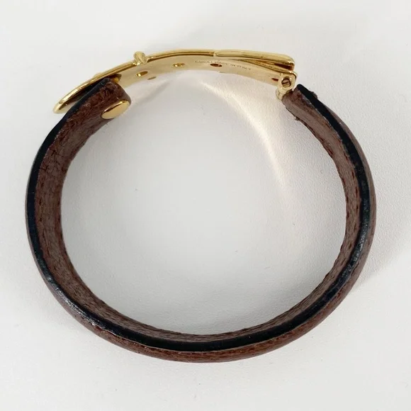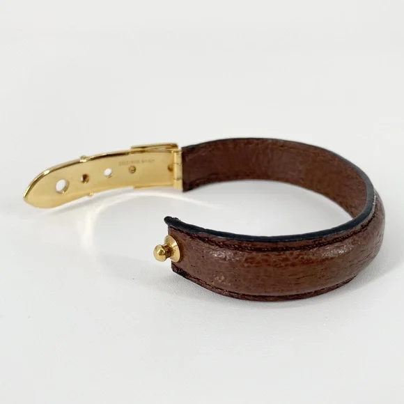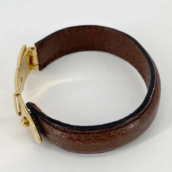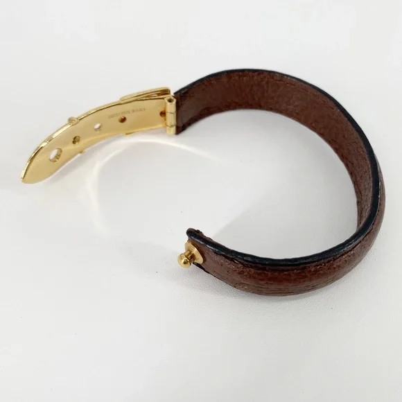 Brown Leather Gold Belt Buckle Bangle BraceletBrown leather bangle braceletHinged belt buckle style closureQuiet luxury - no obvious logo, just a stamp on the inside of the metal...