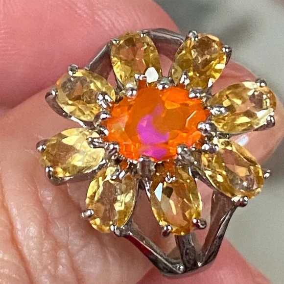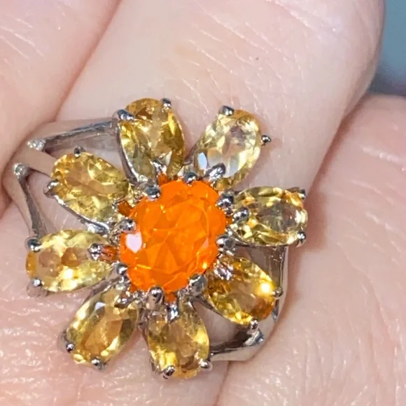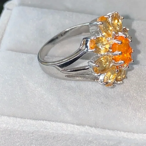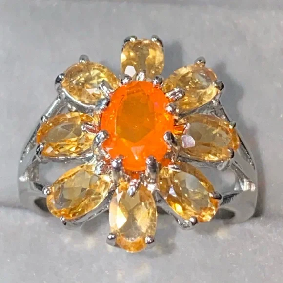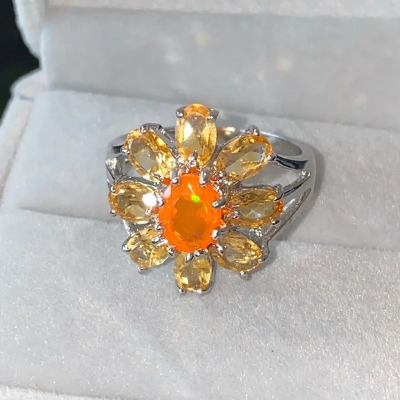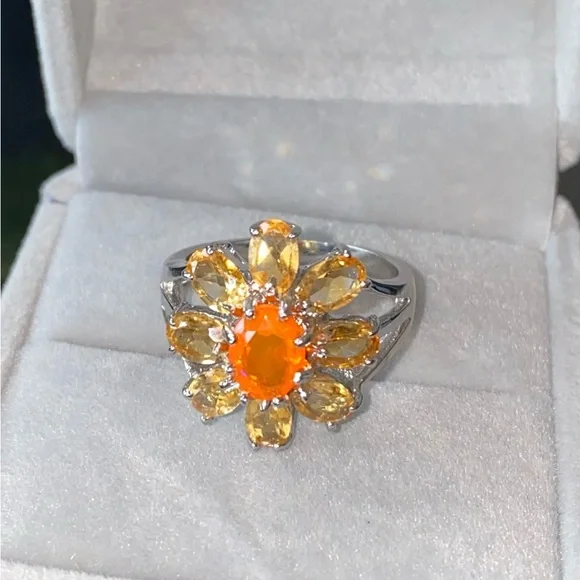 Gorgeous ring with genuine orange Opal 8x6mm, accented with genuine Citrines 6x4mm, 925 sterling silver with 14 K white gold overlay. The ring is high quality, all stones are...