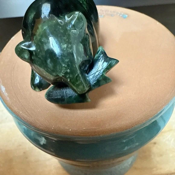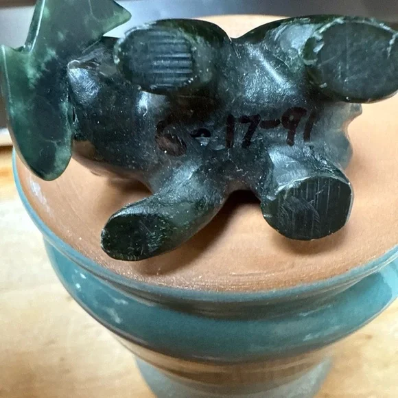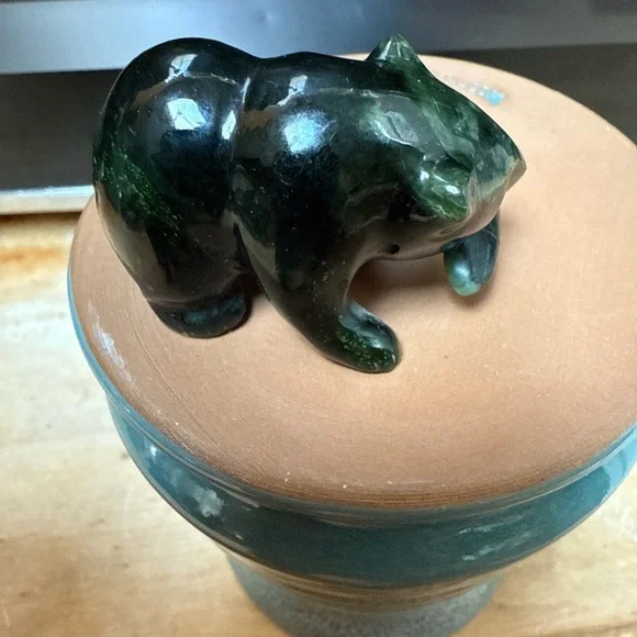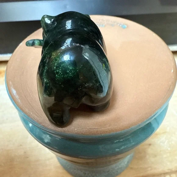 Beautiful variation of green hues in a hand carved nephrite jade bear with a fish in its mouth dated 6-17-91