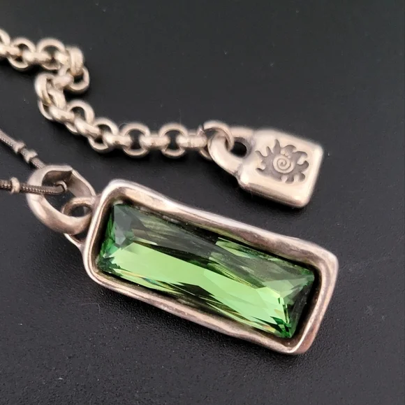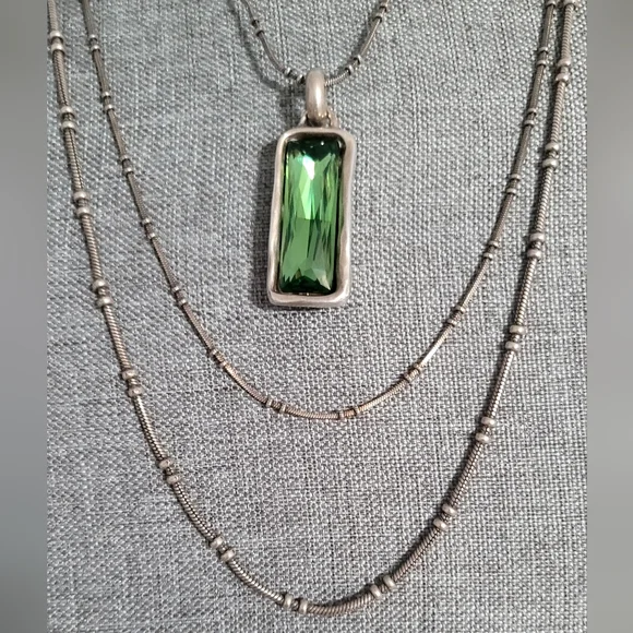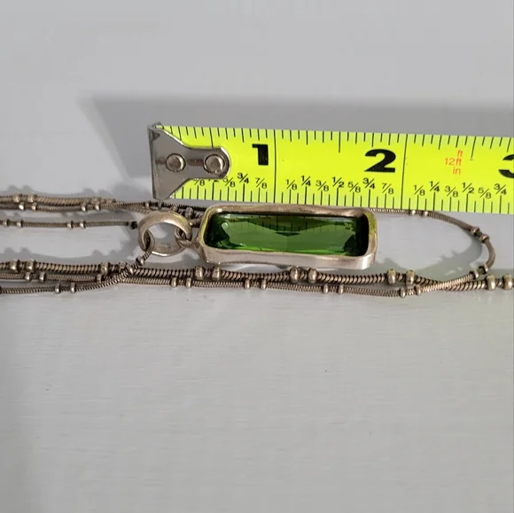 A stunning necklace featuring a green Swarovski Crystal. With multiple strands of silver-plated beads.Lobster clasp closure Very good vintage condition More details in pictures
