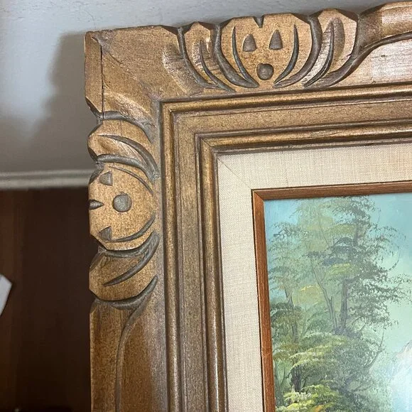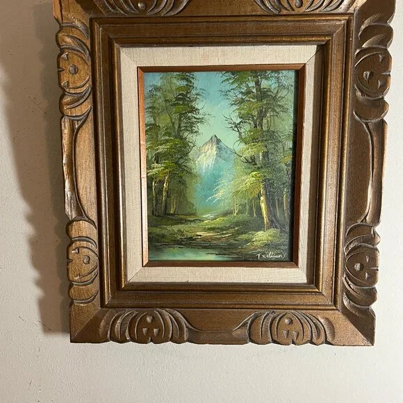 MCM Framed Forrest Landscape with Mountain and Stream Oil on Wood Board signed T. WIliams.Well executed Oil Painted Landscape in a period frame.The frame is a carved wood with a...
