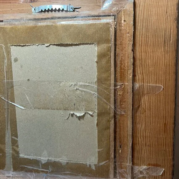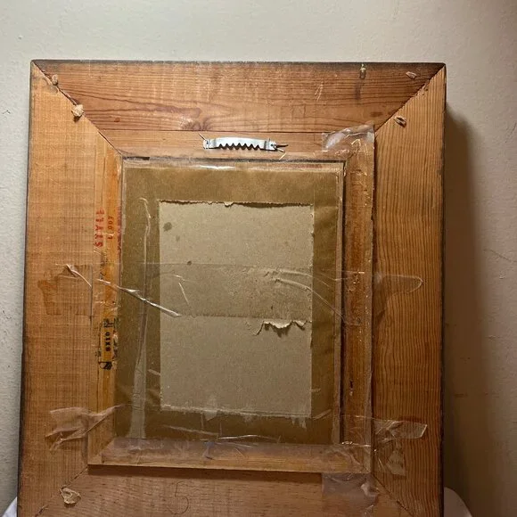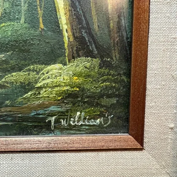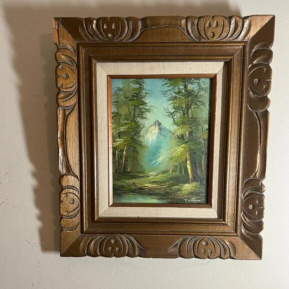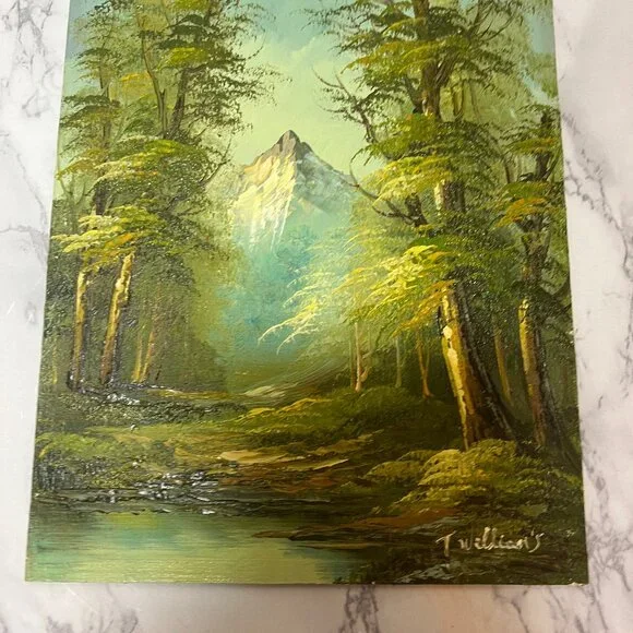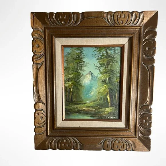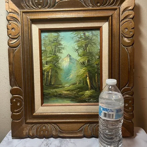 MCM Framed Forrest Landscape with Mountain and Stream Oil on Wood Board signed T. WIliams.Well executed Oil Painted Landscape in a period frame.The frame is a carved wood with a gold Florentine matte gold finish.It shows wear with some chips to the finish and a repair to the upper left corner (shown in last pic).The scotch tape on back needs to be redone.The painting measures 7.5" x 9.5".Framed 17" x 15"