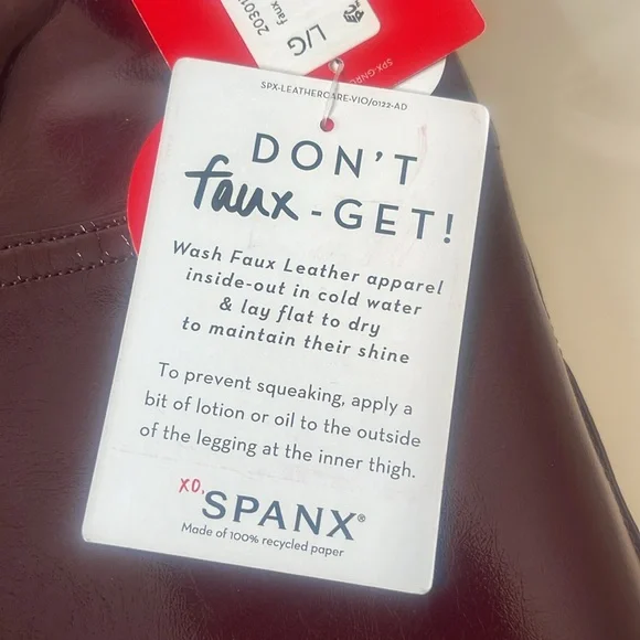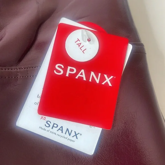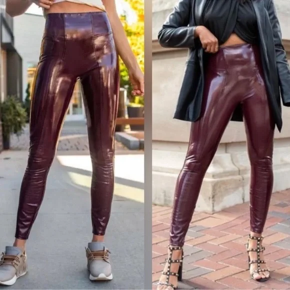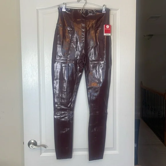 SPANX SPANXShape Faux Patent Leather Leggings Ruby Red Large TallBrand new with tags. Excellent new condition. Shimmy it on! No button or zipper for a smooth lookContoured design for perky rearviewCenter seam free, no camel toe!Faux Leather that flatters. This style features high-shine, smoothing faux patent leather fabric and a hidden contoured waistband. This style was designed with a unique finish that gives them their rich color and shine. Hits at natural waist for great coverage and no muffin topFit Tip: These leggings may feel tight when you first put them on, but don’t worry, they will form to your body. We promise, they´re worth the SPANX shimmy!Inseams: Petite 25” (recommended for 5’4” and under), Regular 27", Tall 30" (recommended for 5’9” and above) when wornAnkle LengthDetailsHigh-shine, faux patent leather fabric shapes and liftsHidden core shaping technologyCenter-seam free for no more camel toeHigh-waisted designDress up or downInsider Tip: Like all patent leather, you may experience some squeakiness during wear. If this occurs, apply lotion or oil to the outside of the legging at the inne