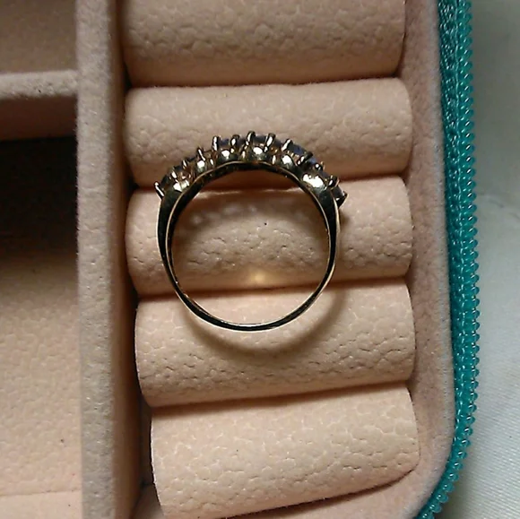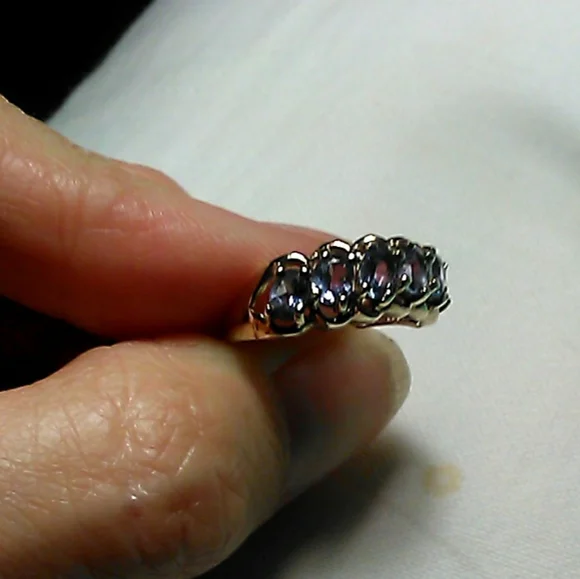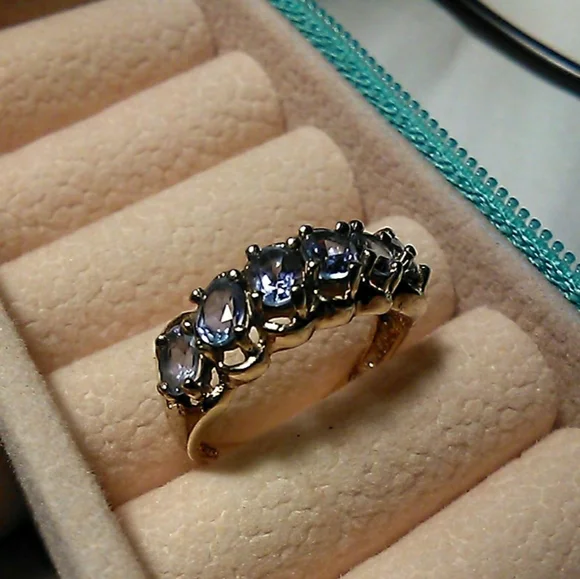 TANZANITE STONES ARE RARE AND WILL BE GONE FOREVER WITHIN YOUR LIFETIME OR YOUR CHILDRENS LIFETIME. THIS IS A 10 KT. GOLD RING AND IT HAS 6 RARE TANZANITE SET ON THE TOP IN A SEMI-CIRCULAR SETTING. THESE ARE A BEAUTIFUL LAVENDER COLOR AND THEY ARE AN OVAL SHAPED CUT. EVEN IF YOU ARE NOT INTERESTED, PLEASE RESEARCH TANZANITE AND UNDERSTANDING THEIR HISTORY AND DISCOVERY IS VERY INTERESTING.