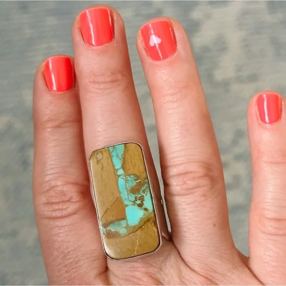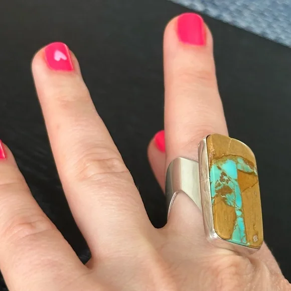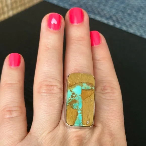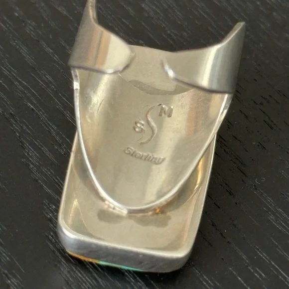 Sterling silver, about a size 8, can adjust a bit, made in arizona