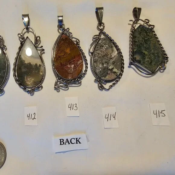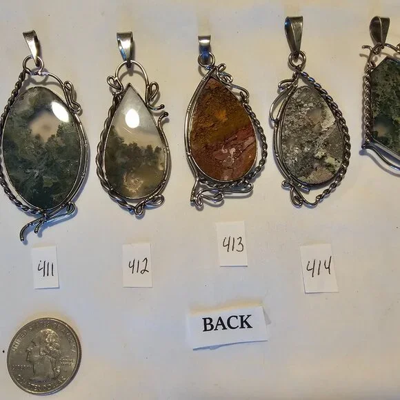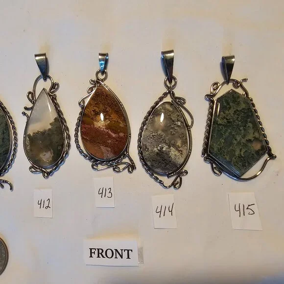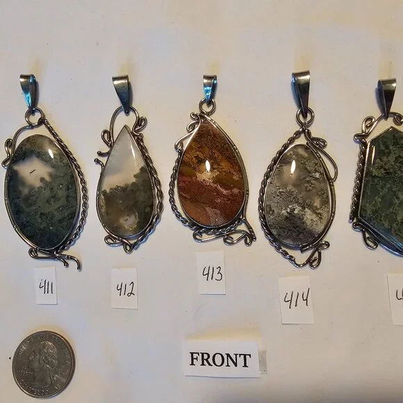 These five unique crystal pendants were handcrafted in Indonesia. Mined from East Java, polished and then wire wrapped with stainless steel material. Each piece is as nature intended! Pictures do not show all of the details in these pieces. This listing is for the pendants only. Coin is for size reference only, it is not included. Indonesian Moss Agate is associated with new beginnings, grounding and connection with Mother Earth, protection and stability against negative energy, spiritual growth, and aligns you with your Higher Self’s divine blueprint. This gemstone can help improve your creativity and manifest your goals. Its connection to Mother Earth keeps you grounded, centered, and stable while providing a protective shield against negative energy. They have been charged with positive vibrations from Reiki energy by a Reiki Master for promoting overall well-being to those that hold or wear it.24 inch braided leather necklace with lobster claw clasp included.