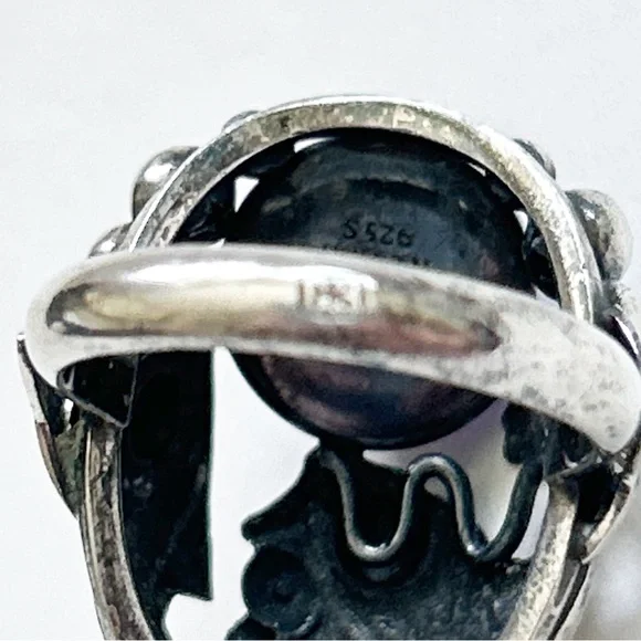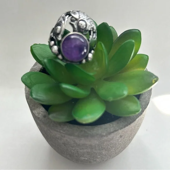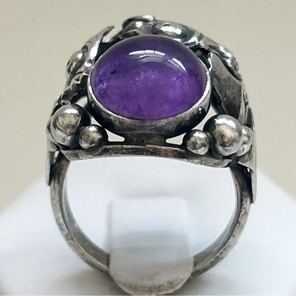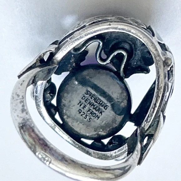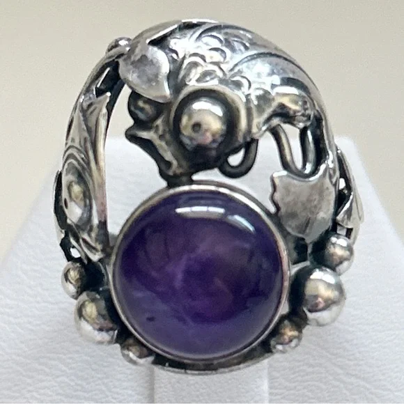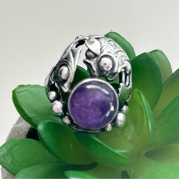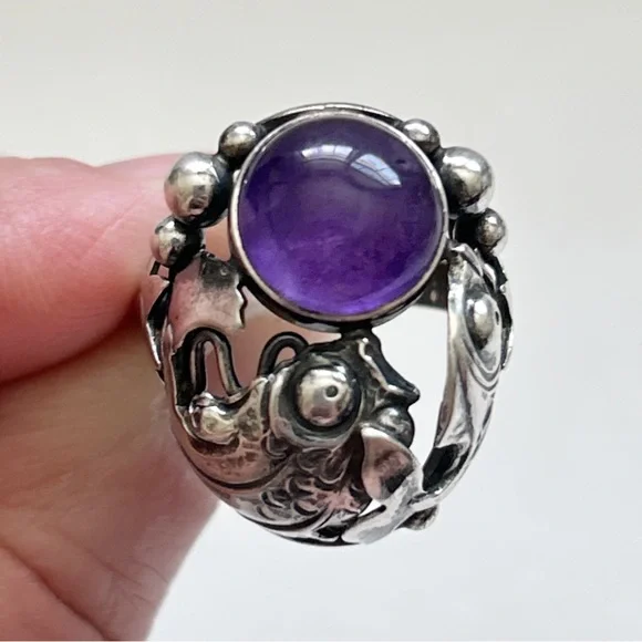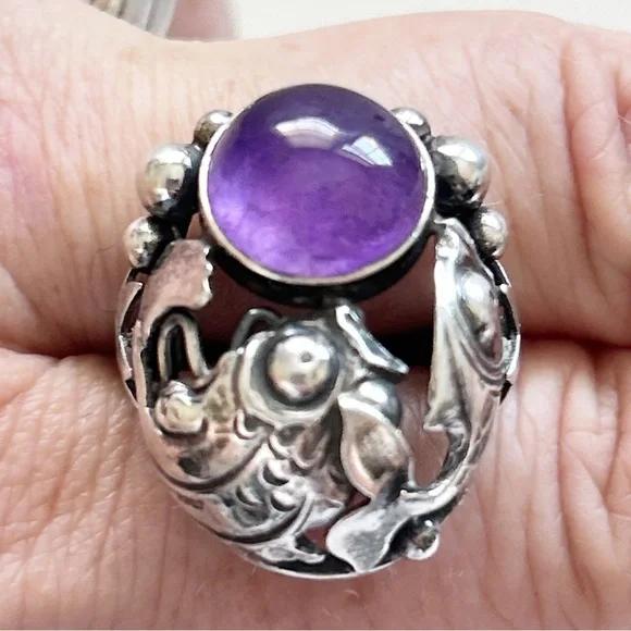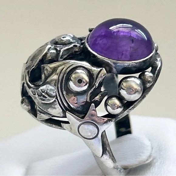 Vintage Niels Erik From Denmark Amethyst Sterling Silver Pisces Fish Ring. Stunning Niels Erik From sterling silver ring features two fish chasing an amethyst cabochon with starfish and bubbles on either side. From was one of the great Danish jewelry designers. This ring is likely from the late 1940s or early 1950s. Amethyst js 13 mm diameter and has very small flea bite chip. Ring top is 25 x 27 mm. Marked Sterling Denmark NE From 925 S. Size 7.25 on mandrel. 8gSmoke-free home.Not a Posh member? Enter my referral code DNSESQ1 when you join and receive a $10 credit.