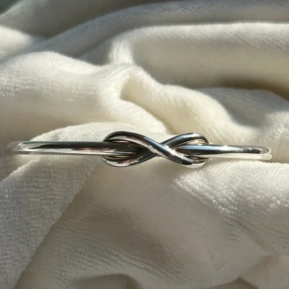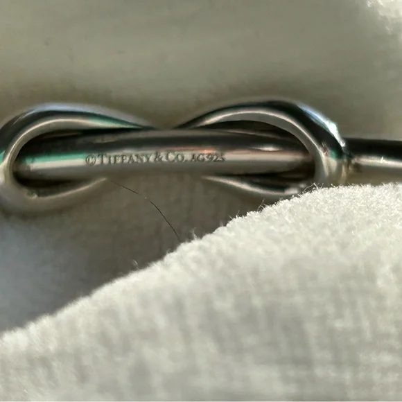 Tiffany.com describes this piece best:“Tiffany Infinity is a powerful symbol of continuous connection, energy and vitality. Enduringly modern, this cuff makes a bold statement worn alone or stacked for maximum impact.Sterling silverMedium, fits wrists up to 6.25…”.This piece is in wonderful preloved condition and will come in a Tiffany box or pouch.