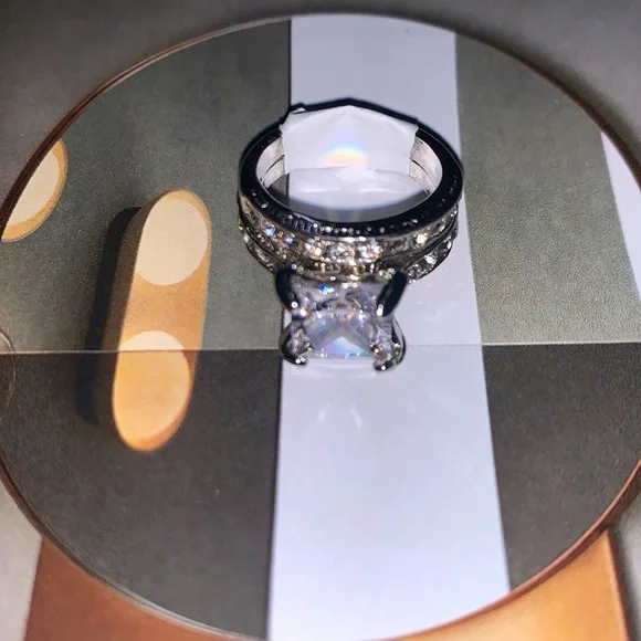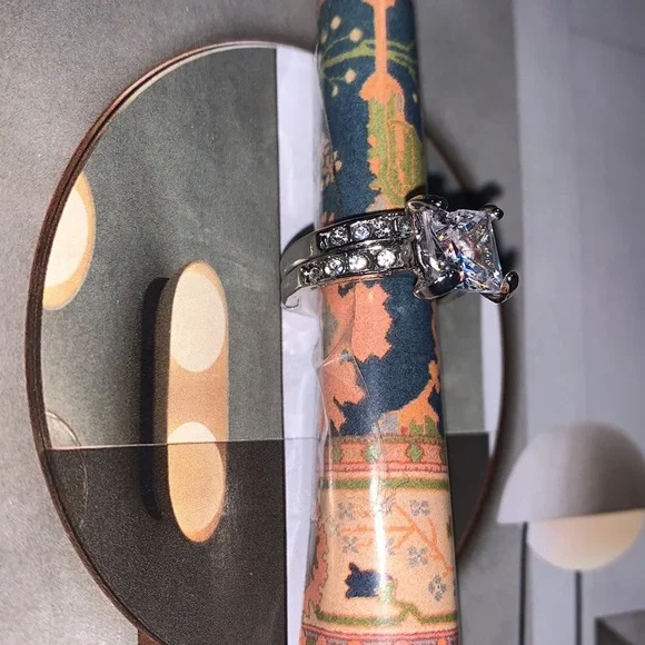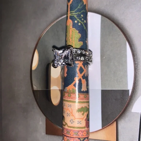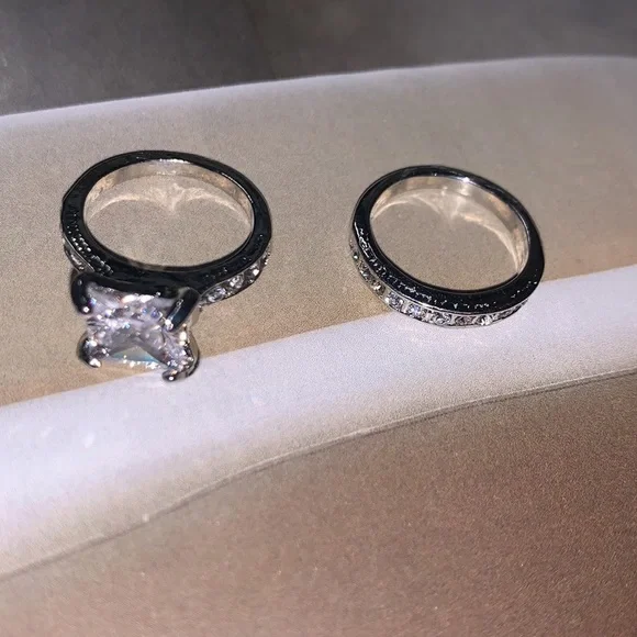Custom made stainless steel engagement/wedding band set. Diva Cut, Princess Sparkle both rings have beautifully laid lab created diamonds truly a stunning set thats Built to last. Keywords: elegant; gift; wife; girlfriend; engagement; date; propose; birthday; weddingPlease feel free to message me for more information and or pics.