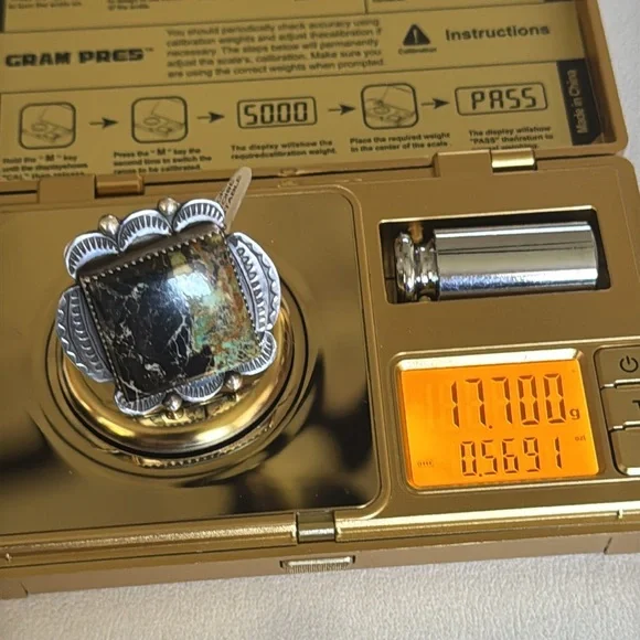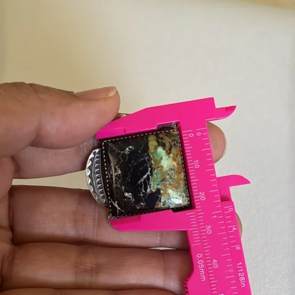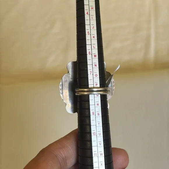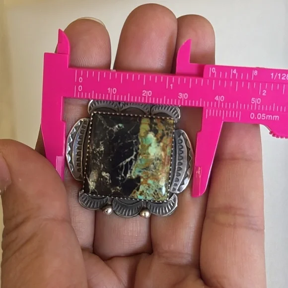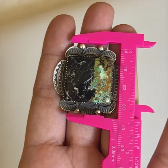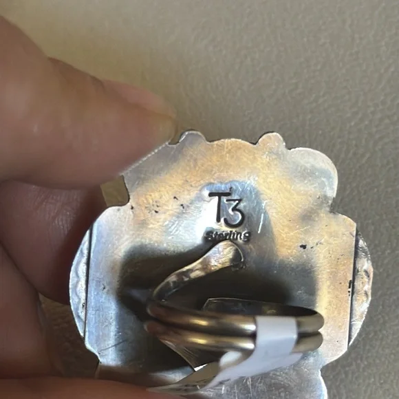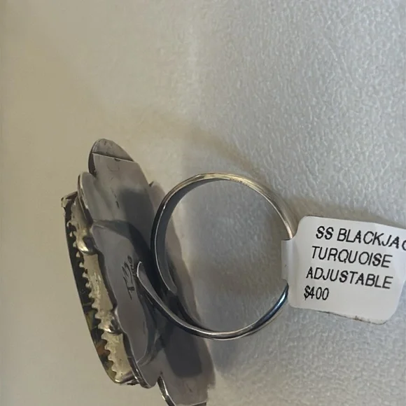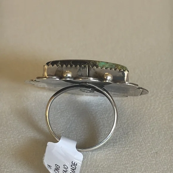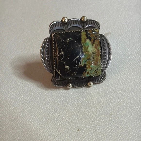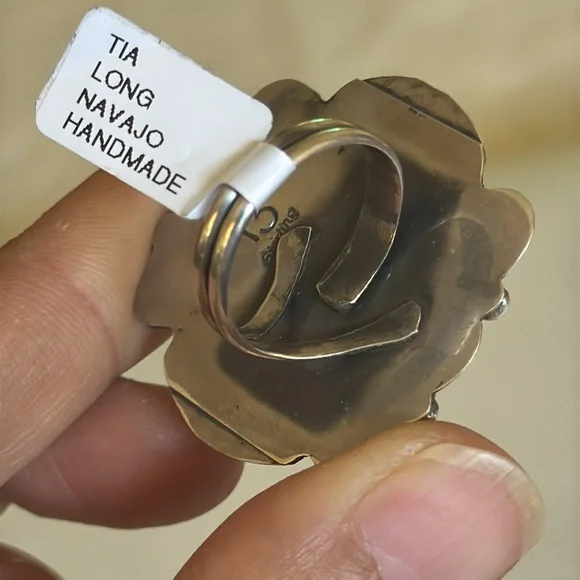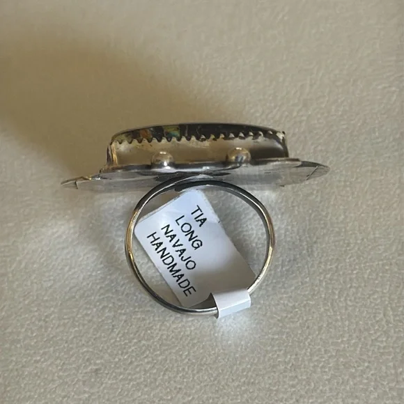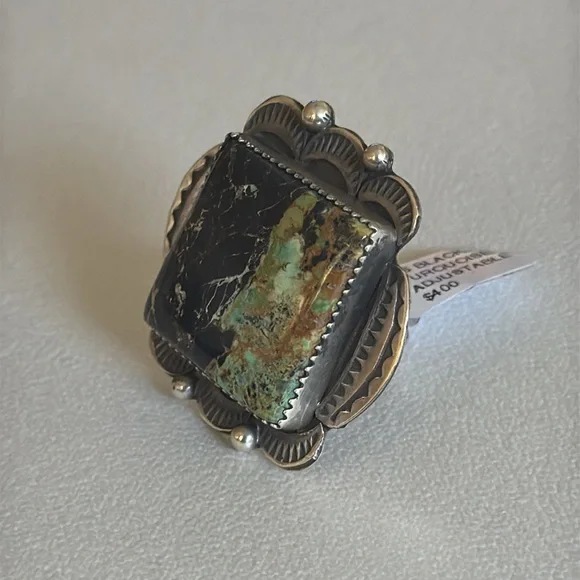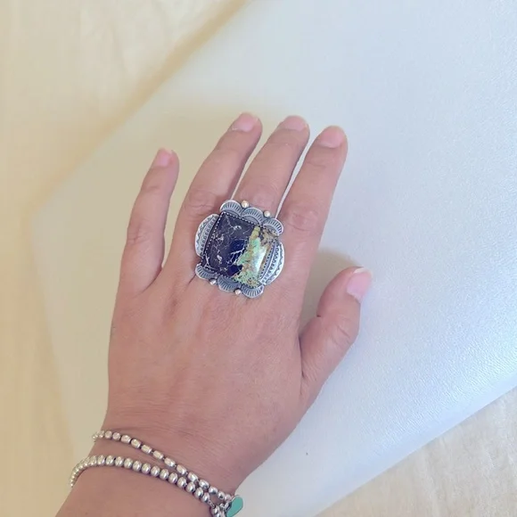 Gorgeous Statement ring, large Blackjack stone, ring it’s adjustable and can fit multiple sizes.Stamped sterling and signed by Navajo artist Tia Long.