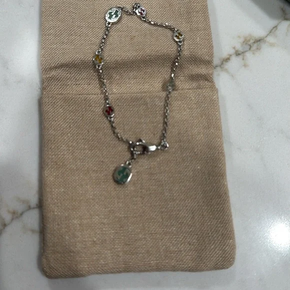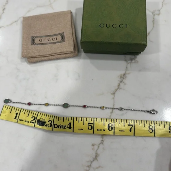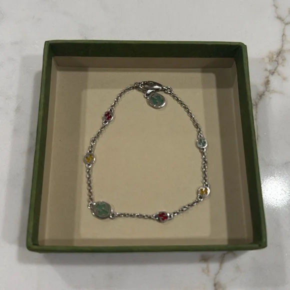 Reposhing this beautiful braceletClassic Interlocking G with enamel. Shades of green, red, and yellowOverall length approximately 8”This closes with a clasp on the chain so there is no ring for clasp. You can tell in pics. Recently professionally polished Includes dust bag and box. May not be original box but that is what it can with when I purchased from previous sellerLOWBALL offers will be ignored