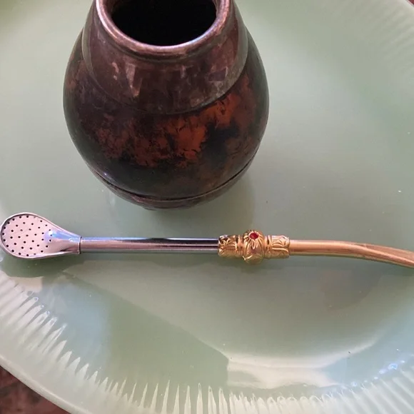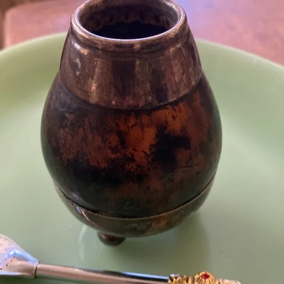 The Yerba mate tea gourd in this post is much older than straw the tea gourd comes from later 1800s while the straw resembles those of the past, but is much current, I’ve paired these together, these Yerba mate tea gourds were used as far back as the 1500s, this is marked, these originated in South America Brazil Uruguay Argentina please see photos for full description. Shipping is same or next day with secure packaging. Thank you. The gourd has silver base and top rim. The straw is a mixed metal.Antique andPatina Collectible
