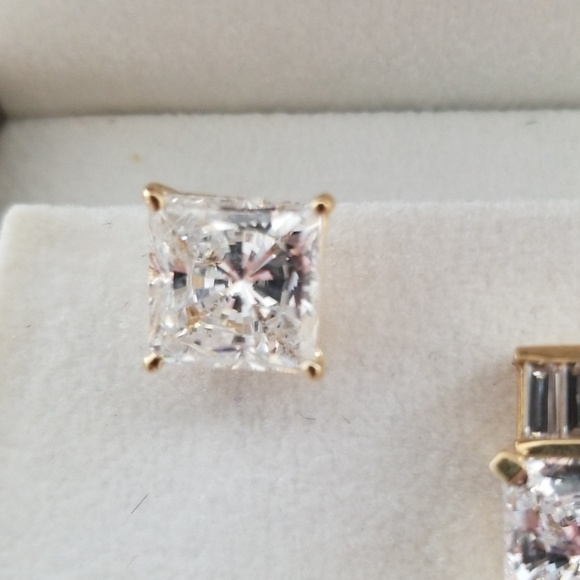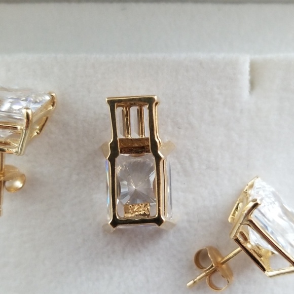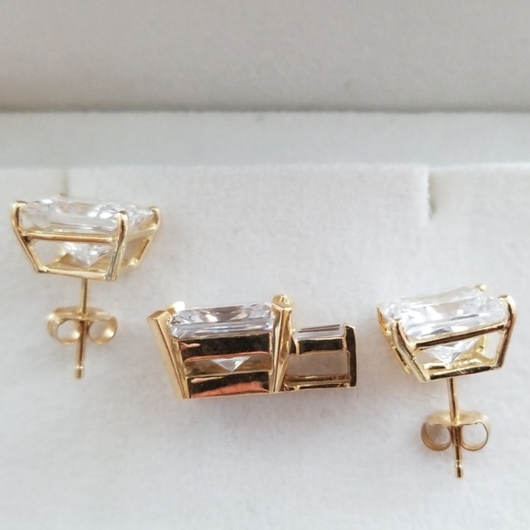 Top quality large cubic zirconia Princess cut Earrings in 14kt yellow gold. Post backs. Coordinating 14kt yellow gold pendant with large radiant cut center stone and emerald cut...