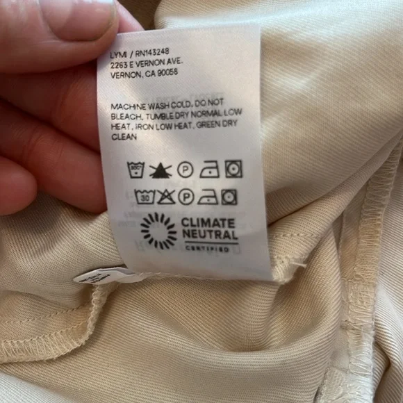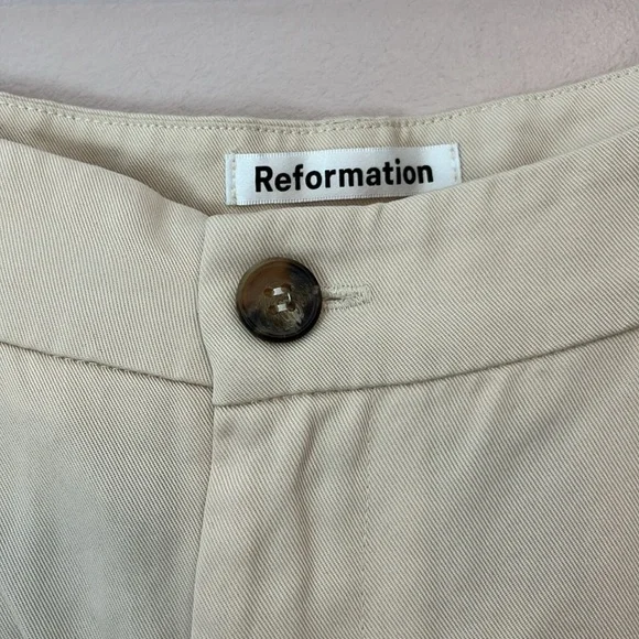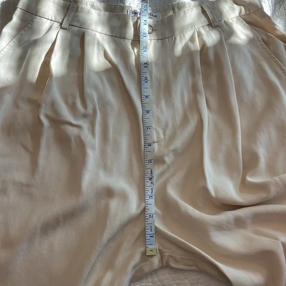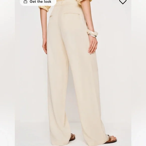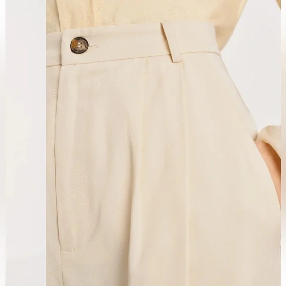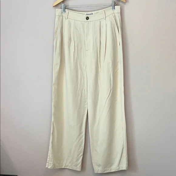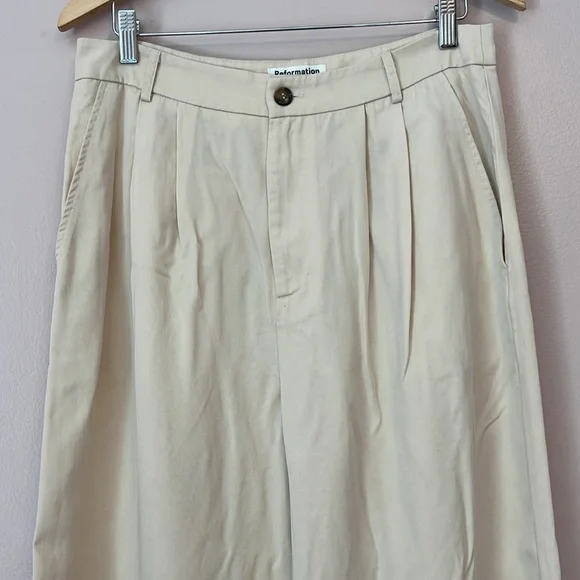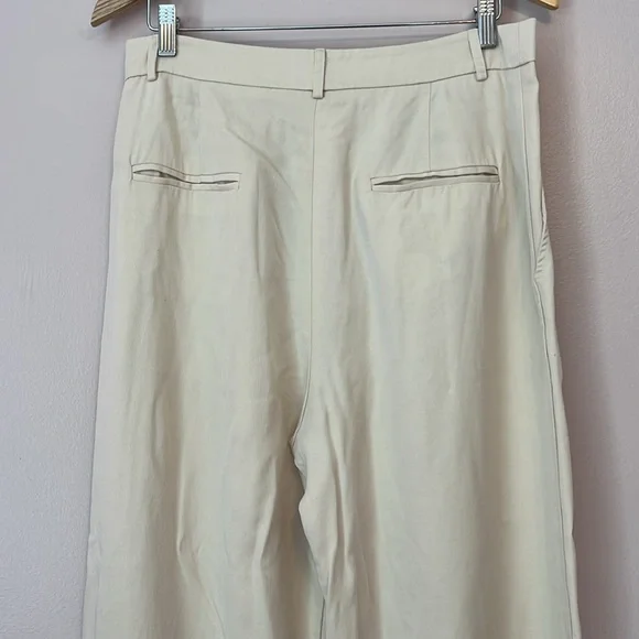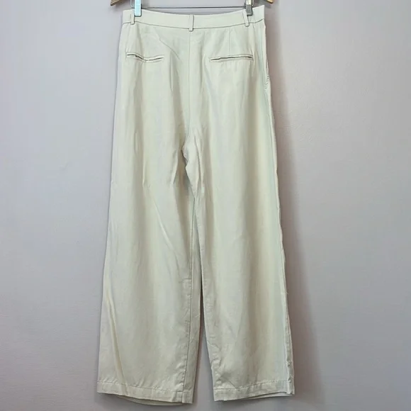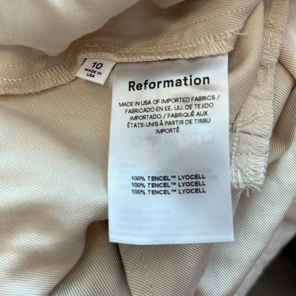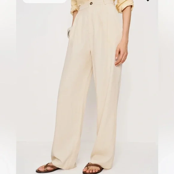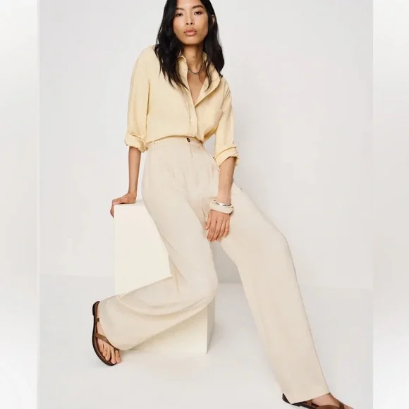 Reformation Mason Pant High Waist Wide Leg Trouser Women’s Sz 10 Ivory Lyocell Exude polish from sunup to sundown in these wide-leg pants perfected by creased details and back welt pockets from Reformation. 100% Tencel® lyocellTencel lyocell is a sustainably produced fiber made with closed-loop processingMachine wash, tumble dryMade in the USAThis brand has B Corp certification, representing business practices with emphasis on social and environmental performance, accountability and transparencyWaist 16”Rise 14”Inseam 27”Leg opening 10.5”Reformation, sustainable, classic, preppy, suiting, office, career, professional, cool, casual, wide leg, high waist, high rise, neutral, minimal, ivory, cream, off-white, spring, summer, fall, trouser, business casual