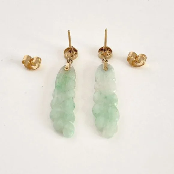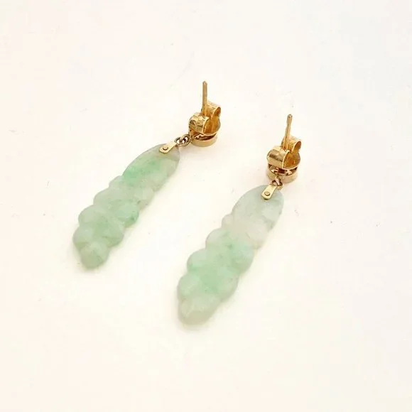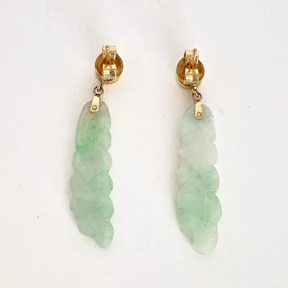 Circa 1970s Delicate Pale Green and White Carved Jade Leaves Dangle 14K Yellow Gold Chinese BLESSINGS Character Pierced Earrings.These earrings came from a very good Chinese friend of our family in the 1980´s. They were jewelry dealers and knew my parents collected Asian jewelry and antiques, so they sold these 1970´s made in Taiwan earrings to us for a good price. They have been well kept all these years and are now ready to find a new loving home!The jade leaf carvings each measure approx 30 x 9 x 2.5 mm. The total drop from the top of the earring is approx 1 1/2 inches.