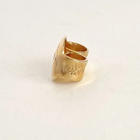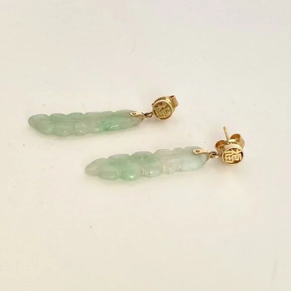 c1976 Carved Jade Leaf 14K Yellow Gold Blessings Character Pierced Earrings