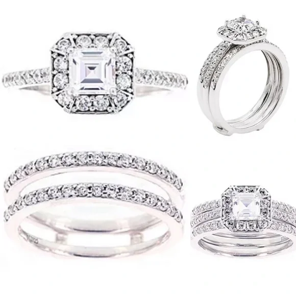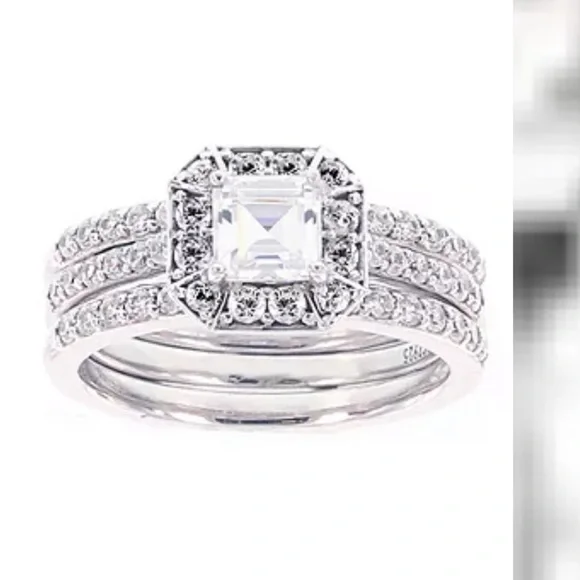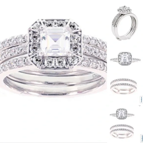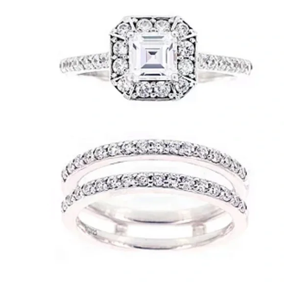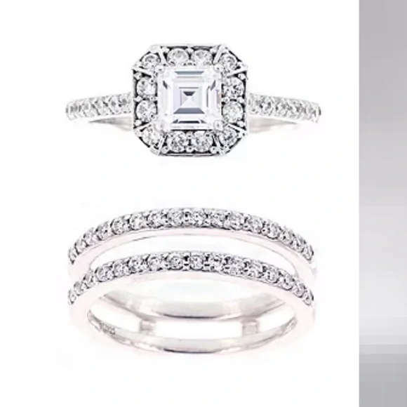 New With TagNever UsedCubic Zirconia Sterling Silver Engagement Ring and EnhancerCubic Zirconia Sterling Silver Engagement Style with EnhancerSquare HaloMetal Rhodium-plated sterling silver Stone Stimulated-Diamond 2 3/4 ct. w.t. Diamond Equivalent