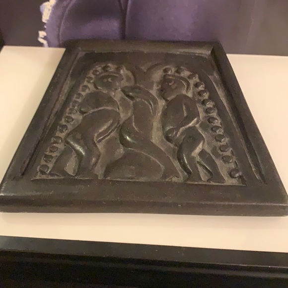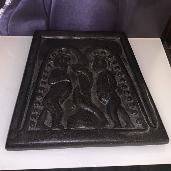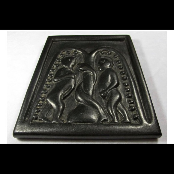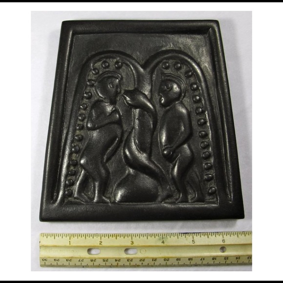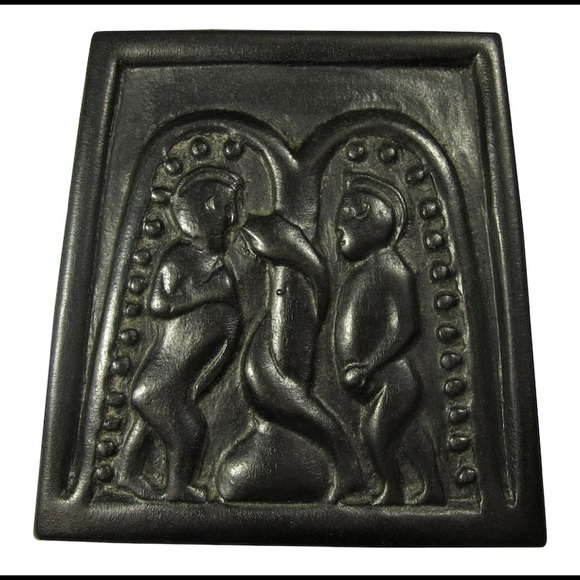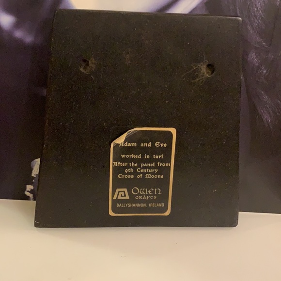 Irish "bog art" is hand-carved from turf, or vegetation that has been compacted in the bogs of Ireland for thousands of years. A form of Celtic folk art that allows you to have a little piece of Eire in your own home. This plaque depicts Adam and Eve being tempted by the serpent in the Garden of Eden, a scene modeled after a panel from the ninth-century Cross of Moone. Trapezoid-shaped plaque measures approx. 6.5" x 6.5" x 0.5" (17cm x 17cm x 2cm) Ballyshannon, Ireland.