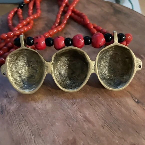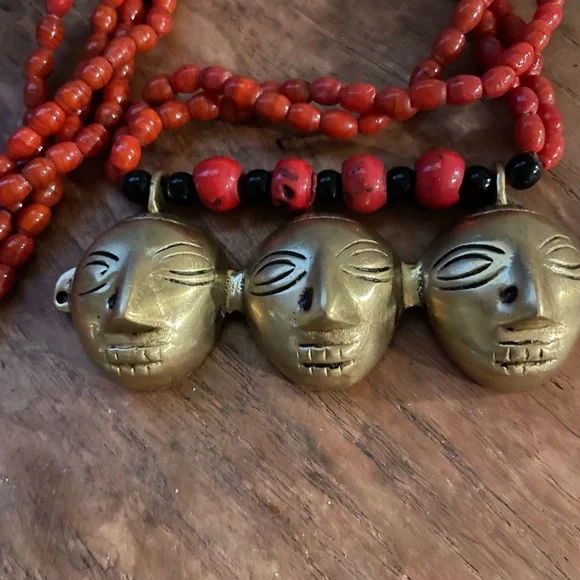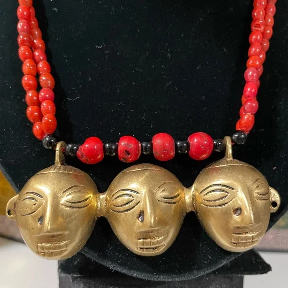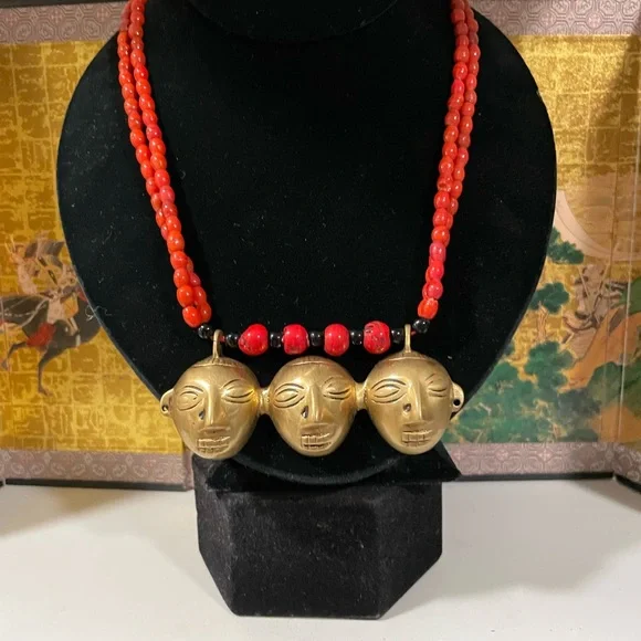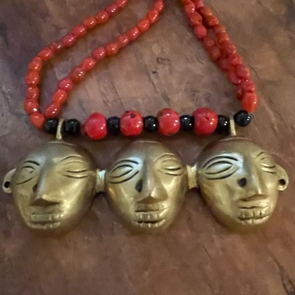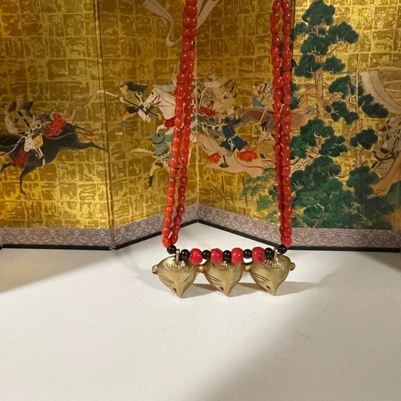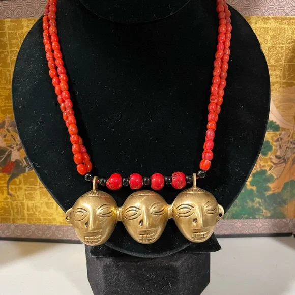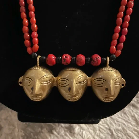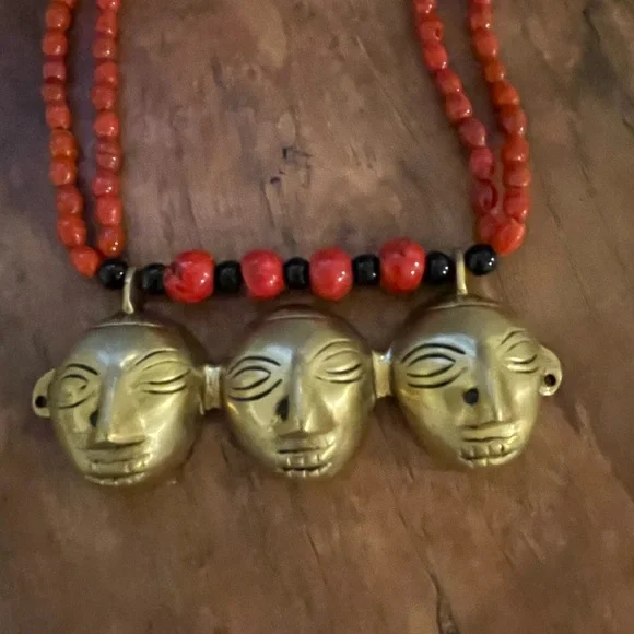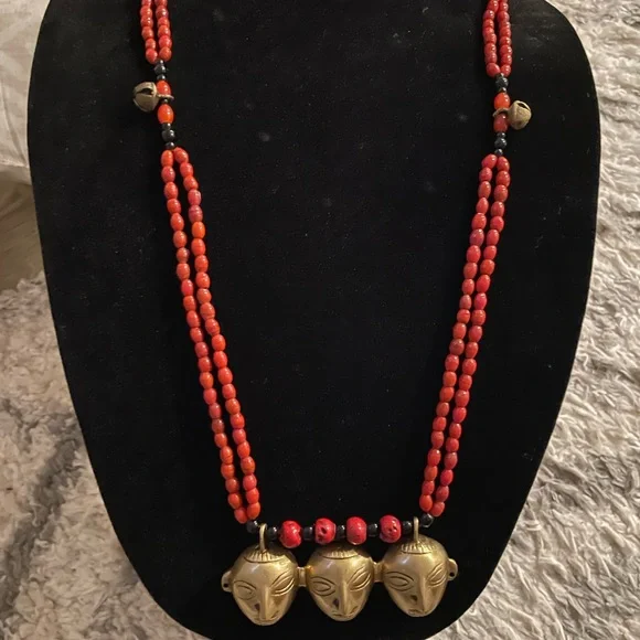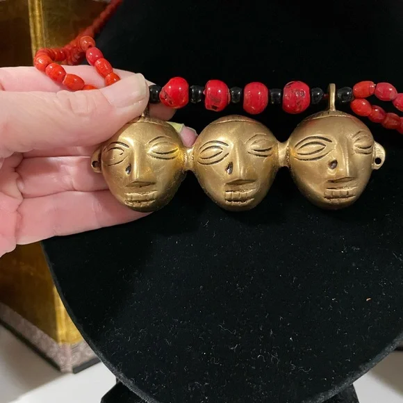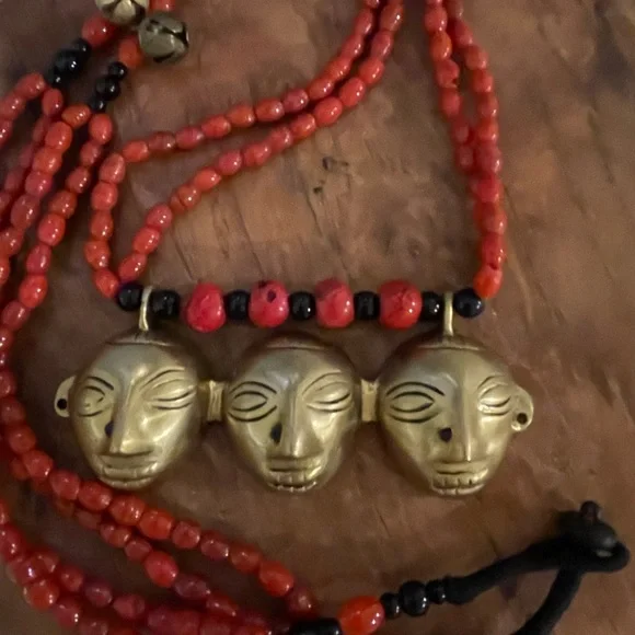 Early 1900’s authentic Nagaland Assam necklace with Red and Black beads and Brass Headhunter Mask Pendant and Brass bells. Double strand 36” necklace. Good condition Antique...