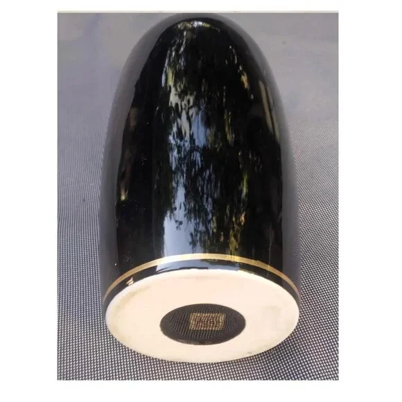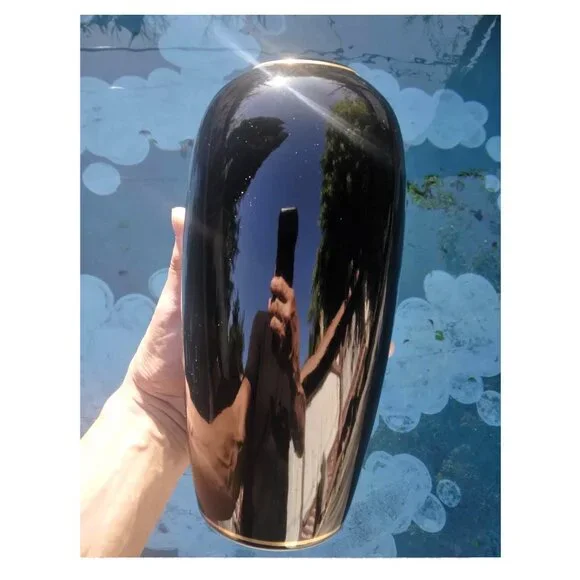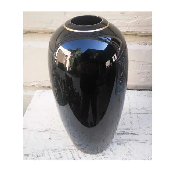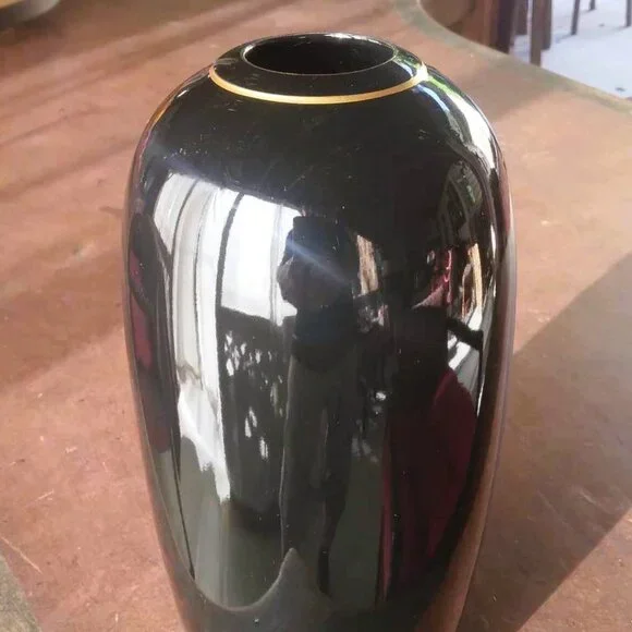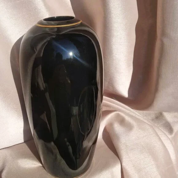 Elegant Vintage Shibata Japanese Lustrous Black w/Gold Trim Tall Porcelain VaseThis is a gorgeous Elegant Vintage Shibata Japanese Lustrous Black w/Gold Trim Tall Porcelain Vase. The vase is presented in an Art Deco essence with a very simple streamlined shape with a completely glossy black field with a ring of gold gilt at the bottom and at the top.The vase measures approximately 9.5" tall by 4.5" wide and is in excellent condition with no visible anomalies.The Shibata Japanese logo is printed on the underside of the piece in gold gilt as well.Shibata porcelain pottery usually is known for their elaborate bird and landscape designing, so this particular Shibata vase is a very unique approach and a departure from their expected norm.Blank Shibata vases are rare.This vase would add an elegant accent and an Art Deco flavor to any environment.