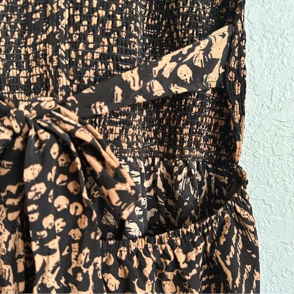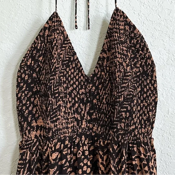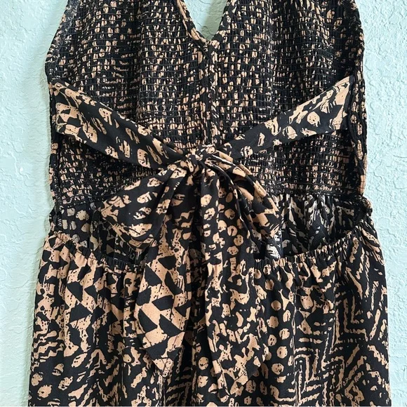 NWT•VICI•Marano Halter Neck Jumpsuit. Beautiful jumpsuit, unfortunately it did not fit me. I wish it did because I absolutely love it! *Brand new with tags. Excellent condition!Size: medium•black and camel color print•adjustable halter with ties •smocked bodice•open back•adjustable wide toe at back•wide leg•elastic at waist•v-neck frontMeasurements: (approximate)•bust: 16” armpit to armpit laying flat not stretched (can also be tied to fit tighter or looser)•waist: 14” laying flat not stretched •rise: 15” crotch to waist•inseam: 29” crotch to ankle*smoke free home