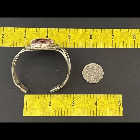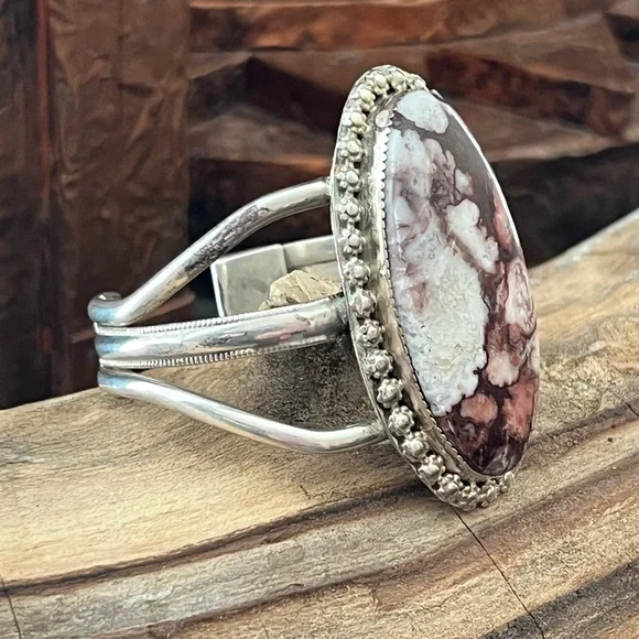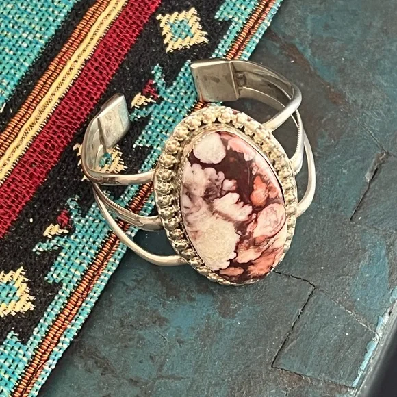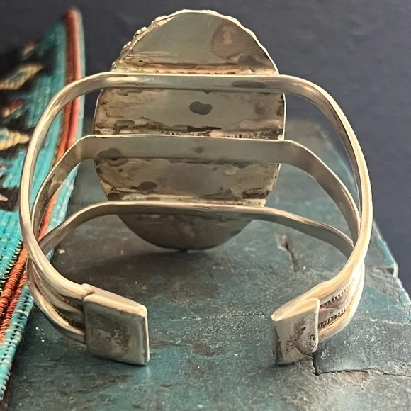 This is a beautiful Native American sterling silver wild horse cuff bracelet. The bracelet features a large wild horse stone set in a sawtooth bezel with a decorative flower border around the stone. The bracelet has a 1” opening and is 6 3/4” around.