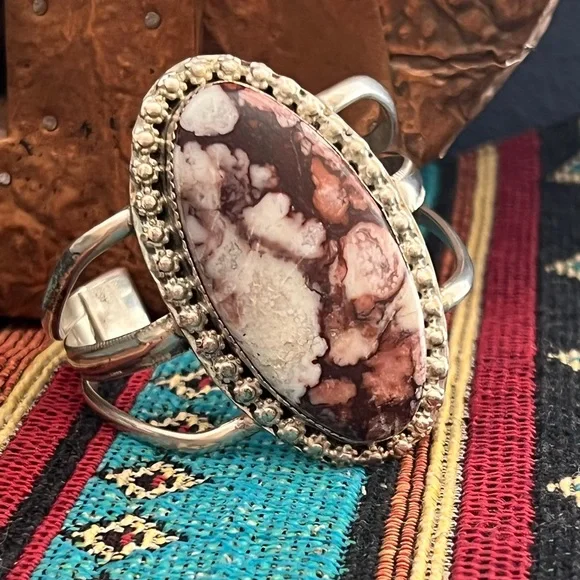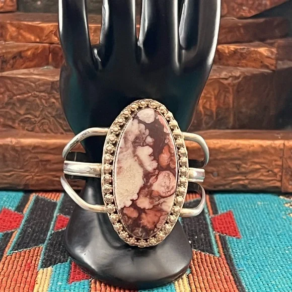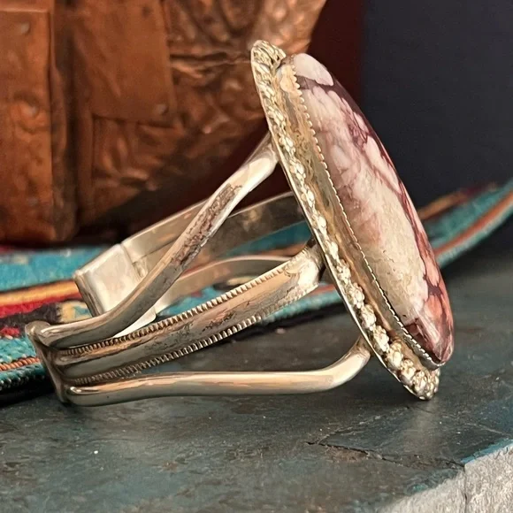 This is a beautiful Native American sterling silver wild horse cuff bracelet. The bracelet features a large wild horse stone set in a sawtooth bezel with a decorative flower...