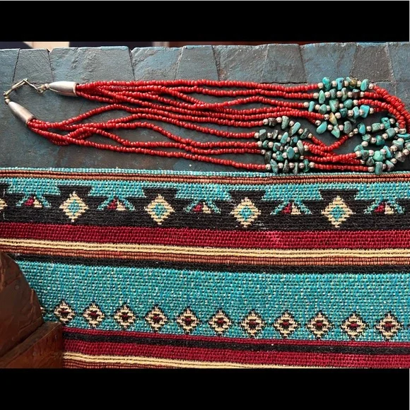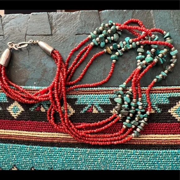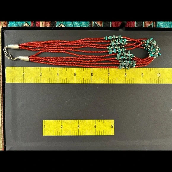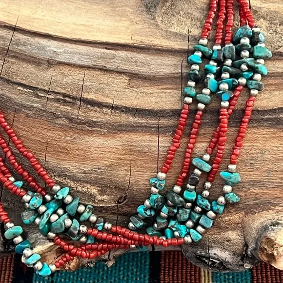 Vintage Native American red coral necklace with turquoise stones and silver beads. This is a handcrafted, five strand necklace with a hook clasp. The necklace is approximately...