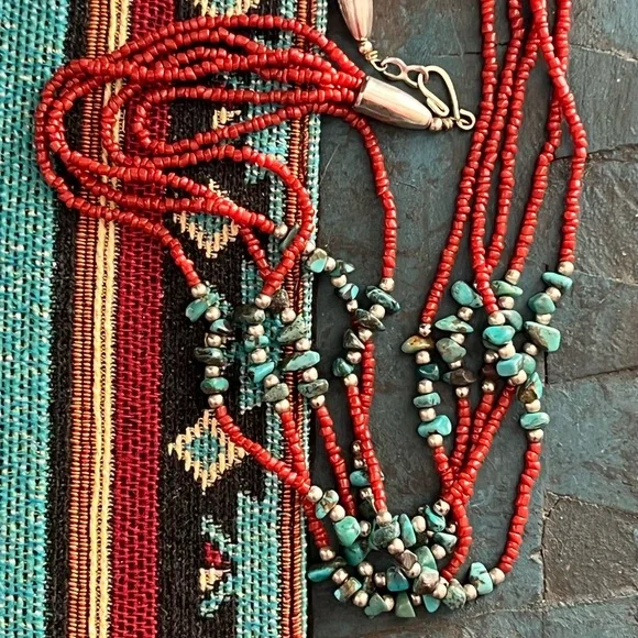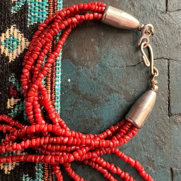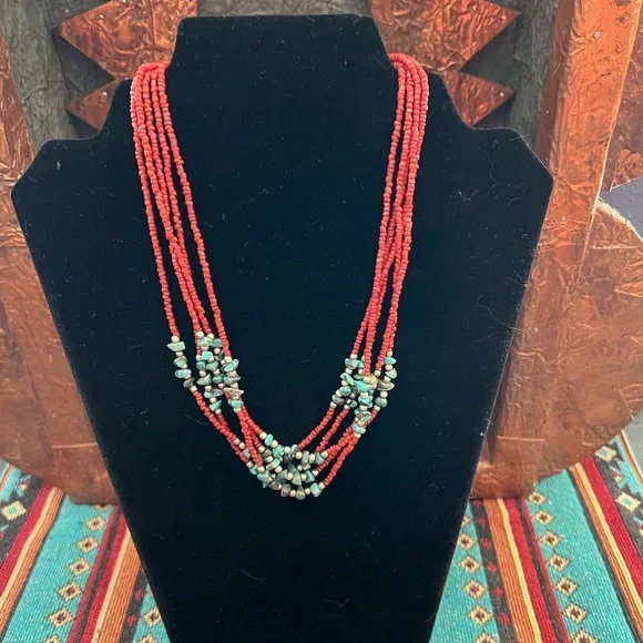 Vintage Native American red coral necklace with turquoise stones and silver beads. This is a handcrafted, five strand necklace with a hook clasp. The necklace is approximately 10” long. See last photo.