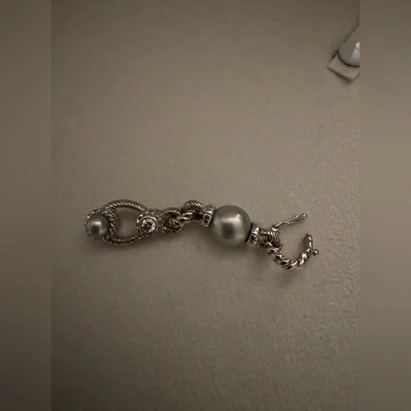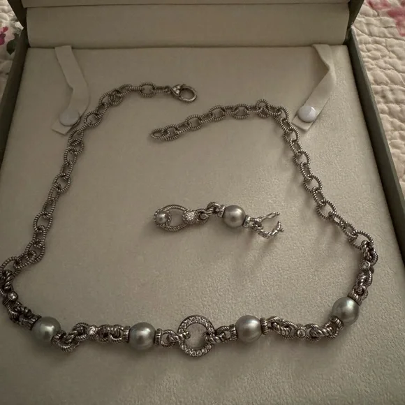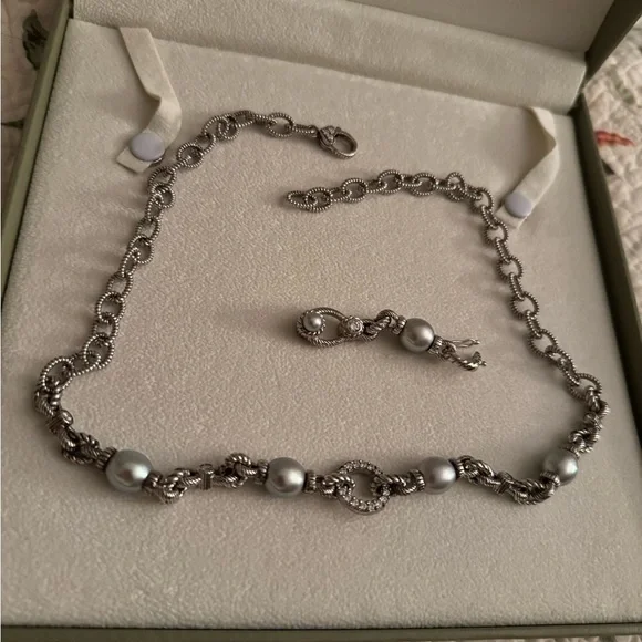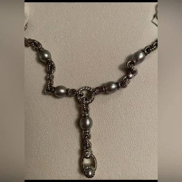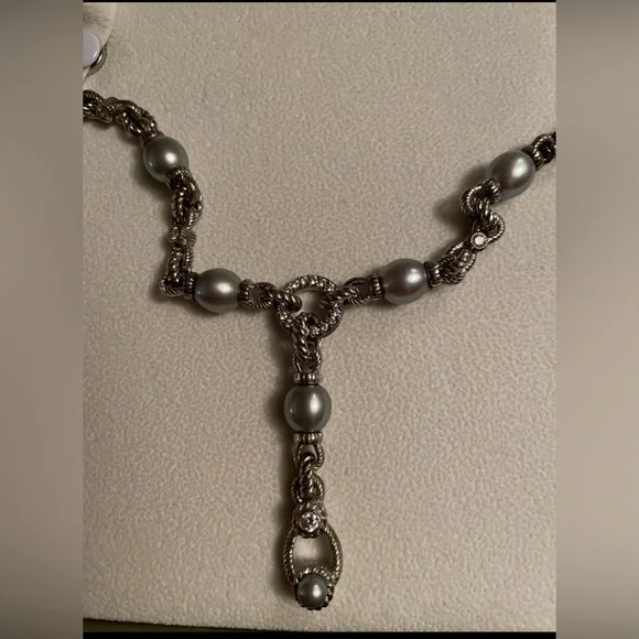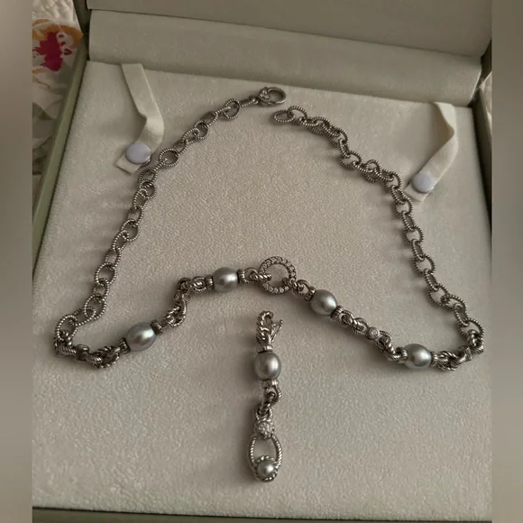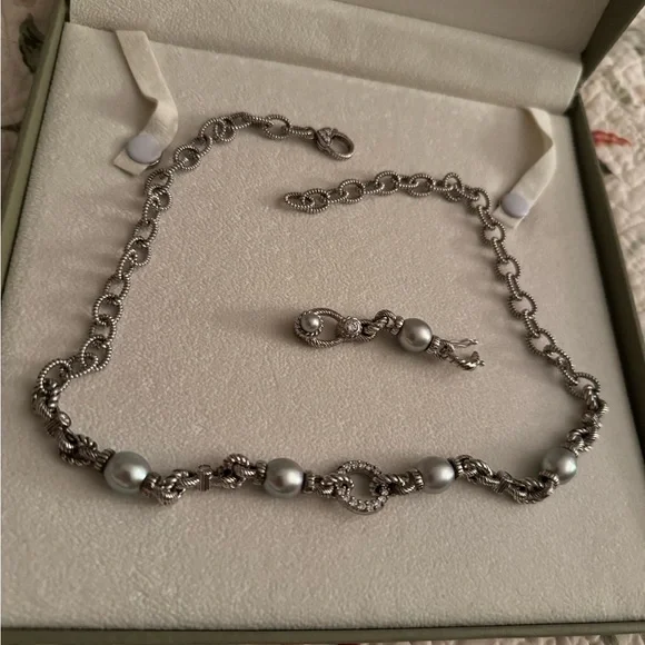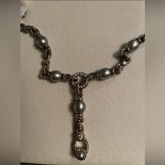 Judith Ripka 19 inch sterling silver necklace with Diamonique CZ and light gray pearls.Enhancer clips on to CZ circle in middle of necklace.Enhancer is 2inches long.Used, pre-owned and pre-worn.Green Judith Ripka box not included because it is broken.