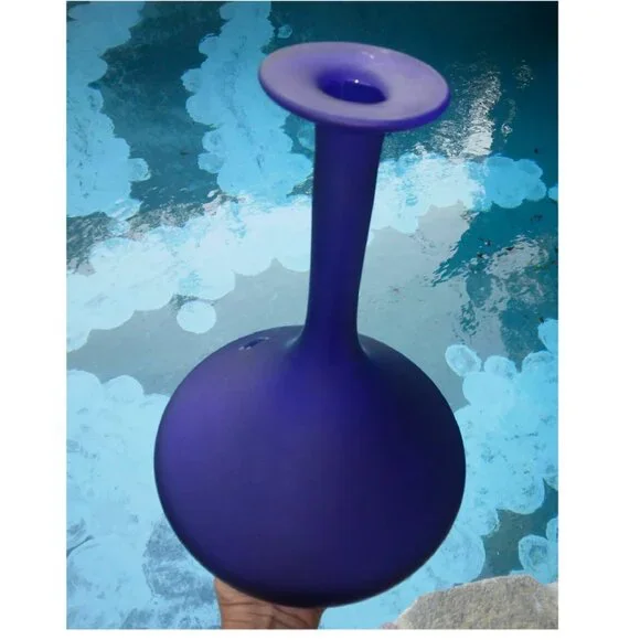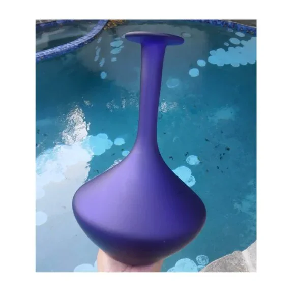 VTG Satin Frosted Dark Blue Modernist Hand Blown MCM Moretti Style Vase by ZodaxThis is a beautiful Vintage, Satin Frosted, Dark Blue, Modernist Hand Blown MCM Moretti Style Vase by Zodax, a company located in California.The vase is designed in a MCM Modernist style similar to the vases created by glass artist Carlo Moreitti of that era.The color of the vase is a dark blue violet, and it is frosted and also quite heavy for its size.The vase measures approximately 12" high by 7.5" wide and is in great vintage condition with very minimal wear with a smooth indented pontil underneath.This vase presents as very sophisticated and would add that element into any environment.
