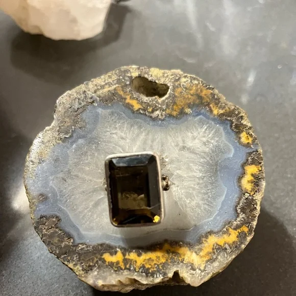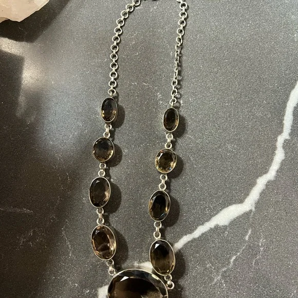 Beautiful bold pieces of smoky quartz are set in sterling silver for an unforgettable necklace and ring.18 in necklace, size 7 ring