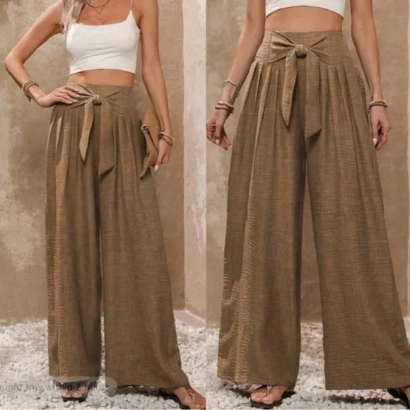 Classic Solid Wide Leg High Waisted Smocked Tie Pants