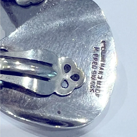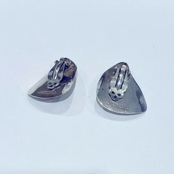 Mid Century Design, Scottsdale Artisan H. Fred Skaggs, sterling silver and polished blue art glass clip on earrings.Excellent condition.Vintage 1950’s. Approx 1.25 height and width at greatest points.Striking color and exquisite pair showcasing his design vision.Makers mark, and sterling marked in perfect working condition perfectly maintained. Rare.