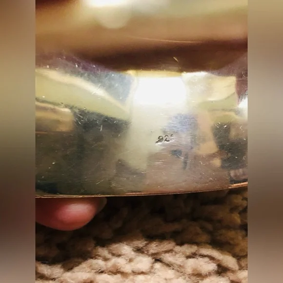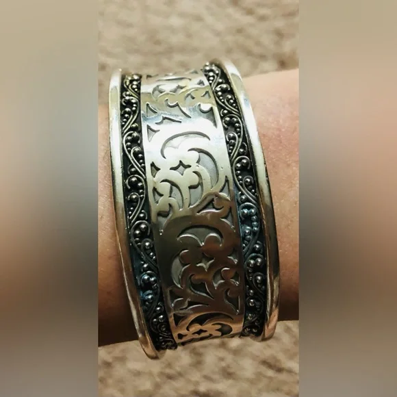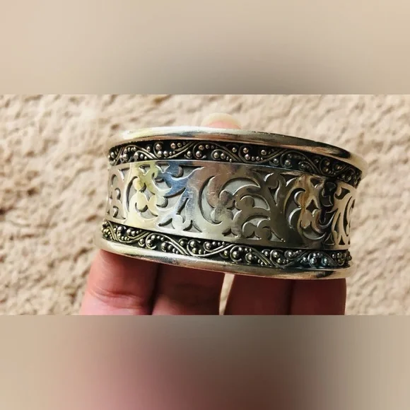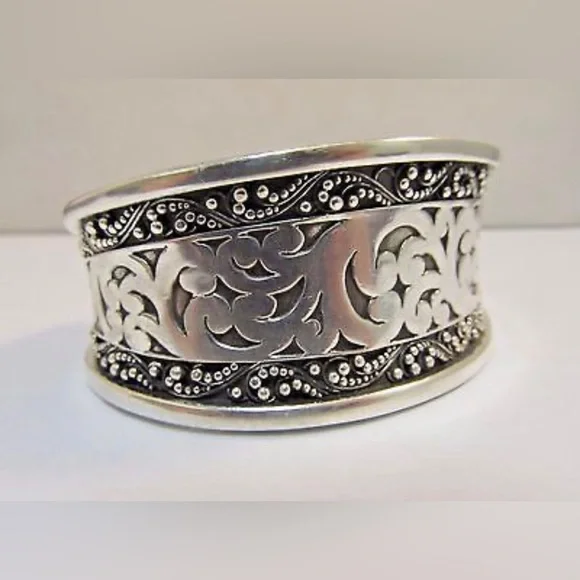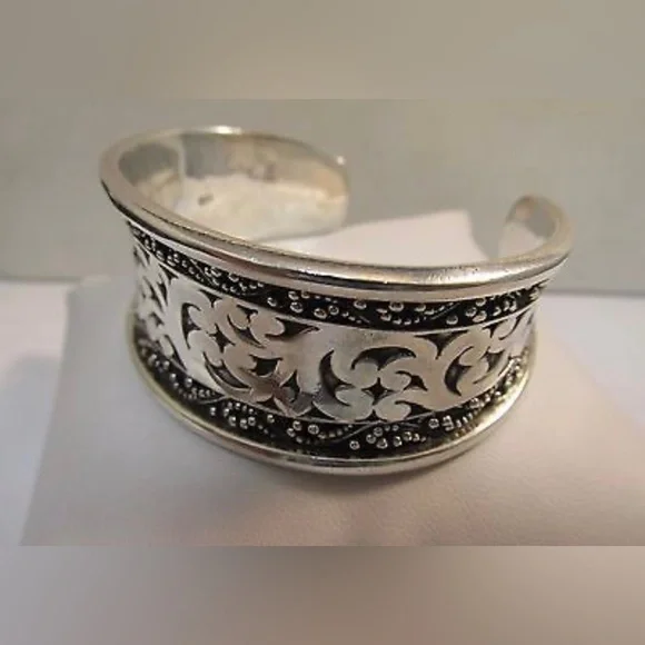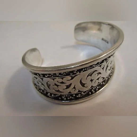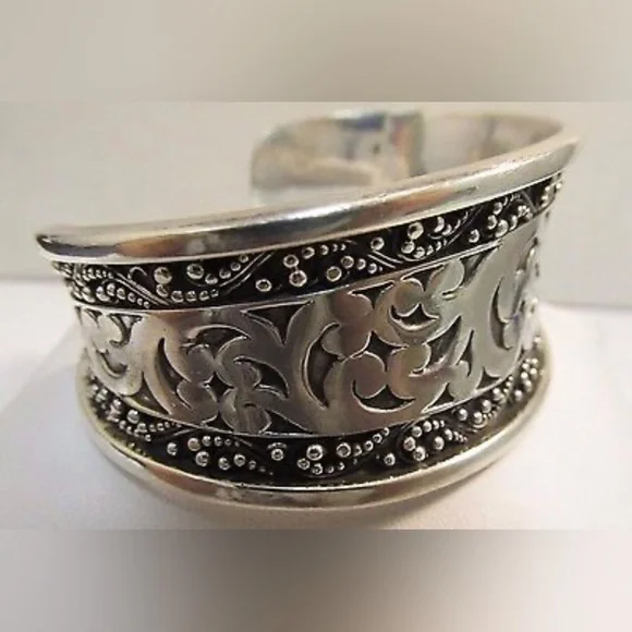 Bracelet measures 2 3/8" Diameter, 1 1/4" Wide at FaceIt weighs 54.8 gramsMarked .925 and Made in Indonesia A timeless piece of jewelryGreat shape and great condition