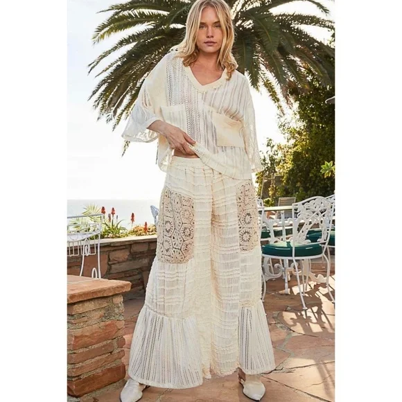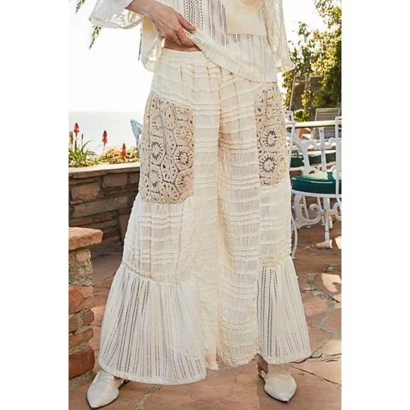 POL Natural Cream Woven Ruffled Wide Leg Pants with Crochet Patch