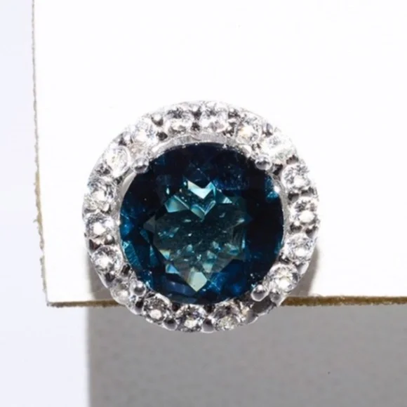 Main Stone Creation: NaturalStyle: Circle HaloMain Stone: Topaz Carat Total Weight: 4.60 Main Stone Color: Greenish-Blue Material: Sterling SilverMain Stone Shape: Round Natural Center Greenish-Blue Topaz: 4.00cts Clarity: Clean Earring Length: 3/8 of an inch Total # Of Stones: 2Cut: Round Natural Side White Topaz: .60cts Clarity: CleanTotal # Of Stones: 36