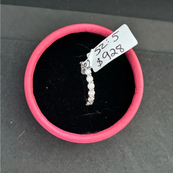 This elegant ring showcases a beautifully crafted silver band ring consisting of 20 .1 ct moissinaite stones for a total of 2 cts. Includes a gift box and the Moissanite Report authenticating the ring and rating the stones excellent cut and clarity.
