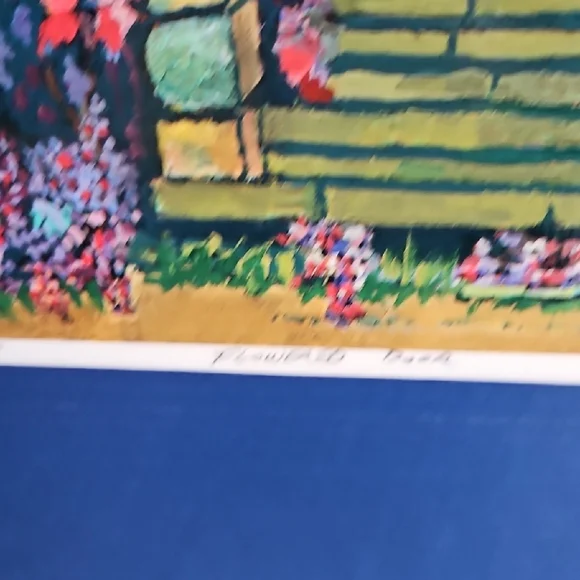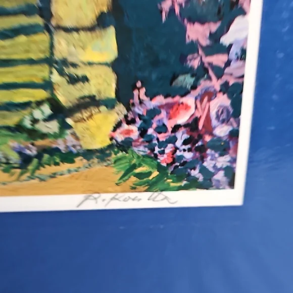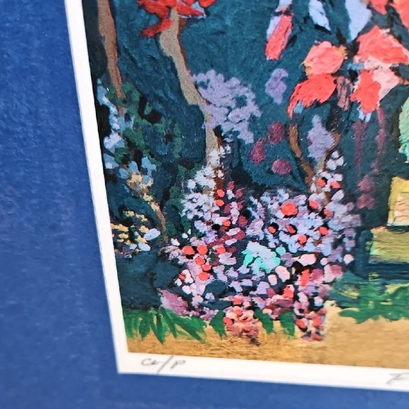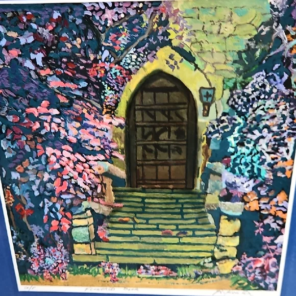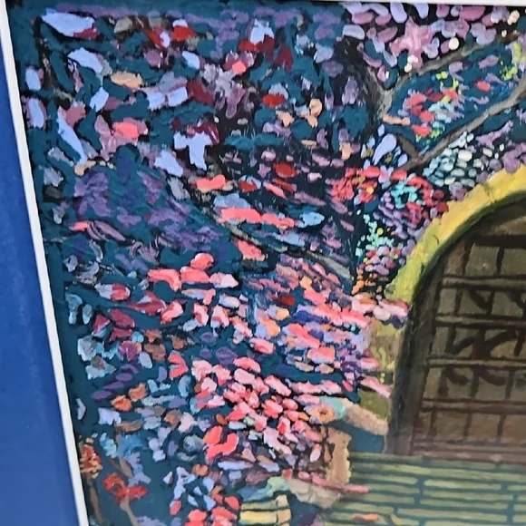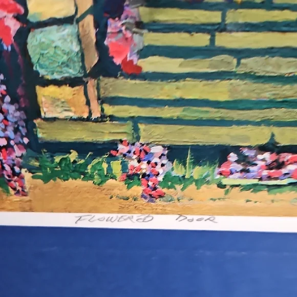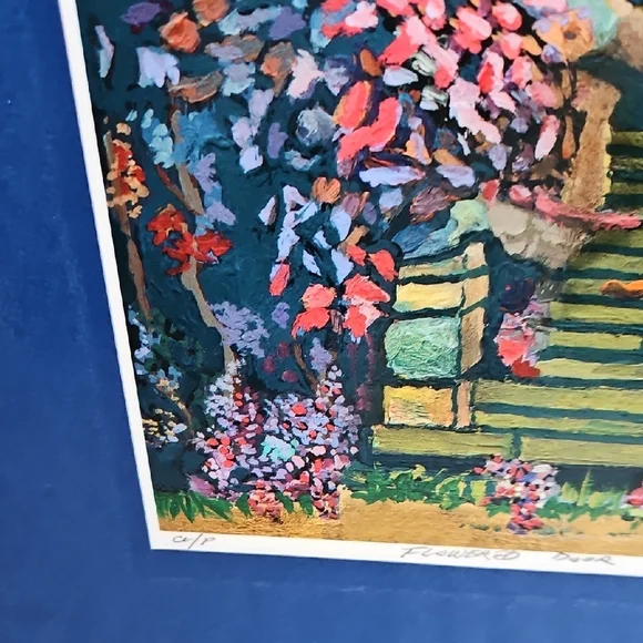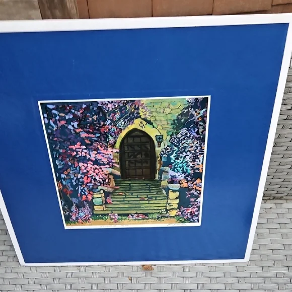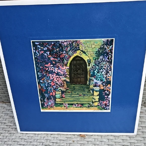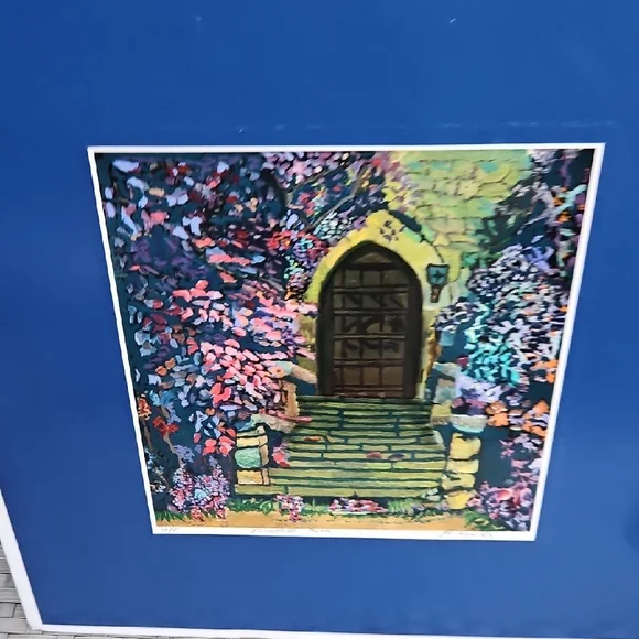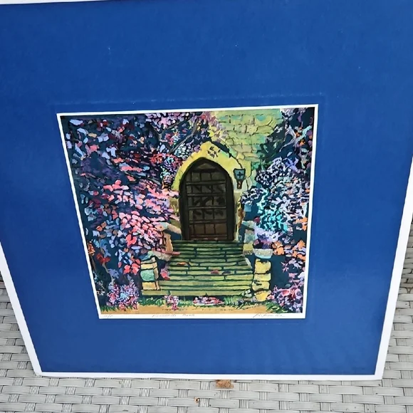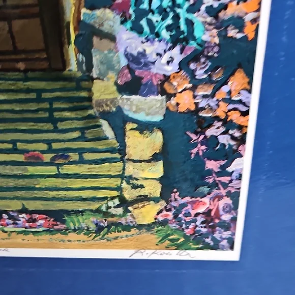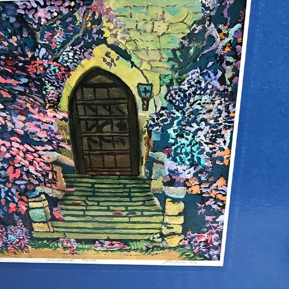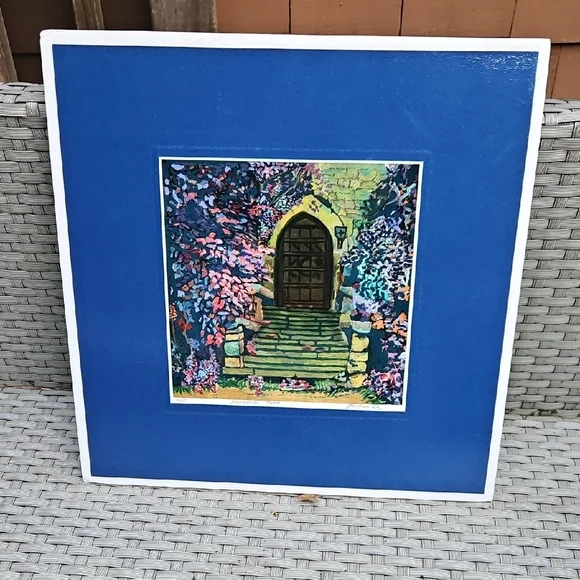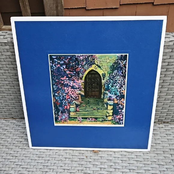 PRINT SIZE= 8.5 X 8.5 INCHES.SIZE WITH BLUE MATTING= 15.5 X 15.5-inch appox. USE WITH CURRENT BLUEMATTING. OR CUT OUT PRINT ANDFRAME.VintageRick Koestler "FLOWERED DOOR"Vibrant Multicolor Doorway Print ArtSet of stone steps leading to a wooden door, with vibrant flowers and foliage surrounding the scene. The artwork has a distinctive style with bold, textured brushstrokes and rich colors. Transform your home with this vibrant art piece, showcasing a multicolor doorway scene framed in a striking blue. Perfect for adding a splash of color and charm to any room.