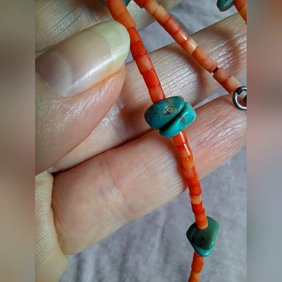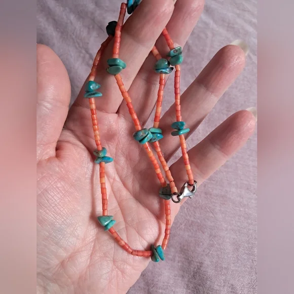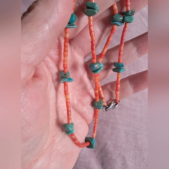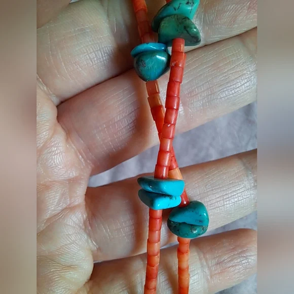 Vintage Native American Natural Red Coral and Turquoise Heishi Necklace 18"
